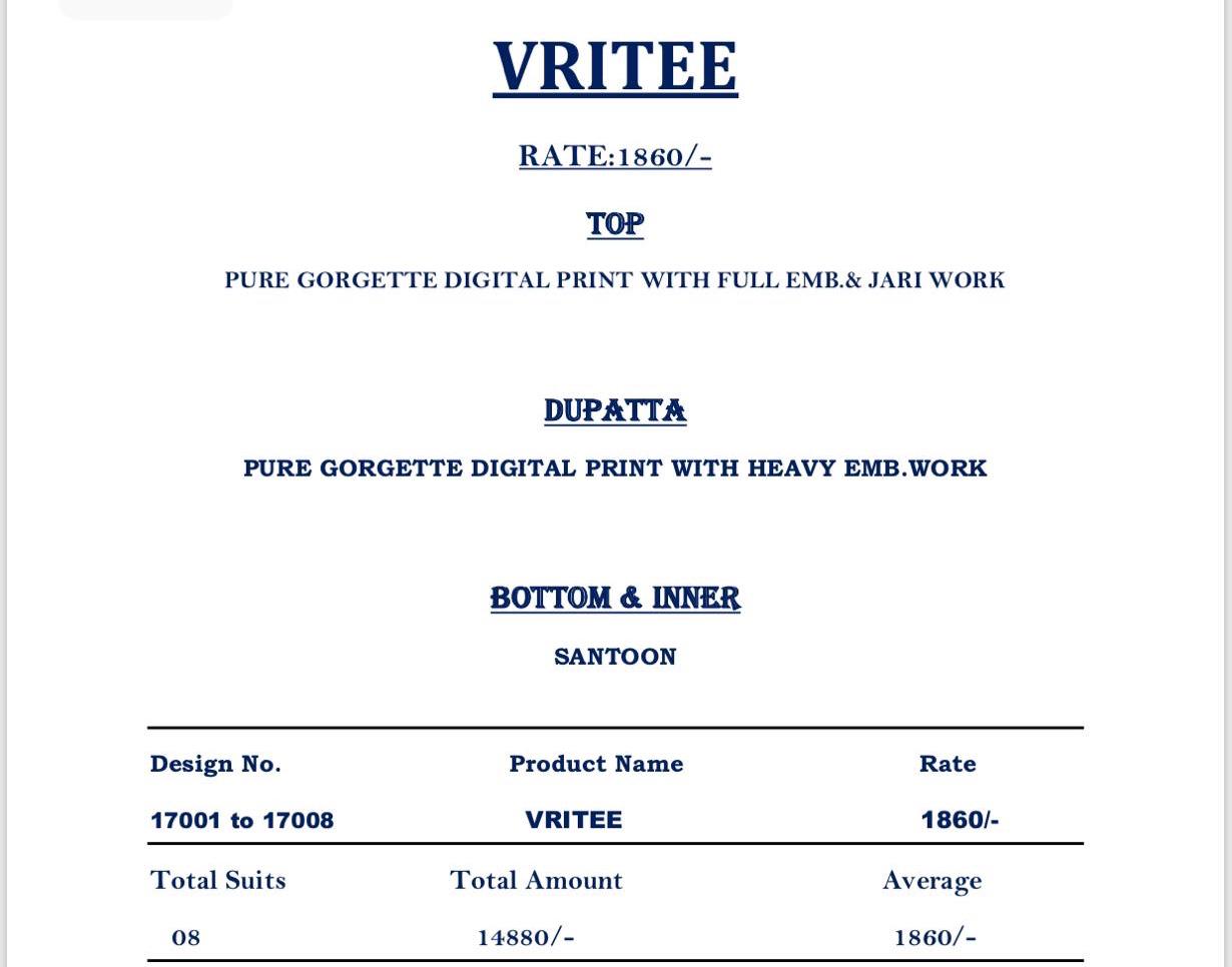 Buy Online Vritee By Zubeda Series 17001 To 17008 Digital Printed Suits Wholesale Supplier Gujarat 8 Pcs of Full Catalogue at Wholesale Price. Looking for Vritee By Zubeda Series 17001 To 17008 Digital Printed Suits Wholesale Supplier Gujarat Full Catalouge at Best Price? Buy Now Vritee By Zubeda Series 17001 To 17008 Digital Printed Suits Wholesale Supplier Gujarat at Wholesale Rate of Rs 14880 with Total 8 Pcs from authroized dealer and supplier of ZUBEDA Brand. Cost of Each piece is just only Rs 1860 which is very low and affordable price to resale the product in your retail store ,This is Surat based Wholesale Supplier & Dealer of ZUBEDA Brand. Click on Brand name to Know more about ZUBEDA Brand's products.Call or Whatsapp on 9898838984 for booking or enquiry