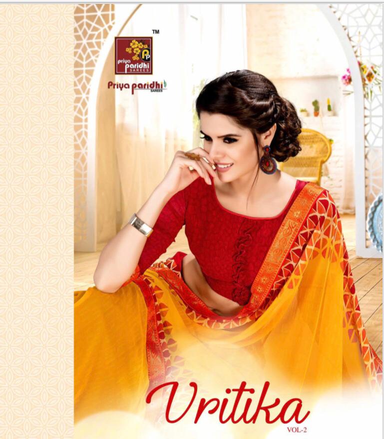 Buy Online Vritika Vol 2 By Priya Paridhi 90431 Series Georgette Printed Saree Catlog Wholesale Dealer Surat 10 Pcs of Full Catalogue at Wholesale Price. Looking for Vritika Vol 2 By Priya Paridhi 90431 Series Georgette Printed Saree Catlog Wholesale Dealer Surat Full Catalouge at Best Price? Buy Now Vritika Vol 2 By Priya Paridhi 90431 Series Georgette Printed Saree Catlog Wholesale Dealer Surat at Wholesale Rate of Rs 6500 with Total 10 Pcs from authroized dealer and supplier of PRIYA PARIDHI Brand. Cost of Each piece is just only Rs 650 which is very low and affordable price to resale the product in your retail store ,This is Surat based Wholesale Supplier & Dealer of PRIYA PARIDHI Brand. Click on Brand name to Know more about PRIYA PARIDHI Brand's products.Call or Whatsapp on 9898838984 for booking or enquiry