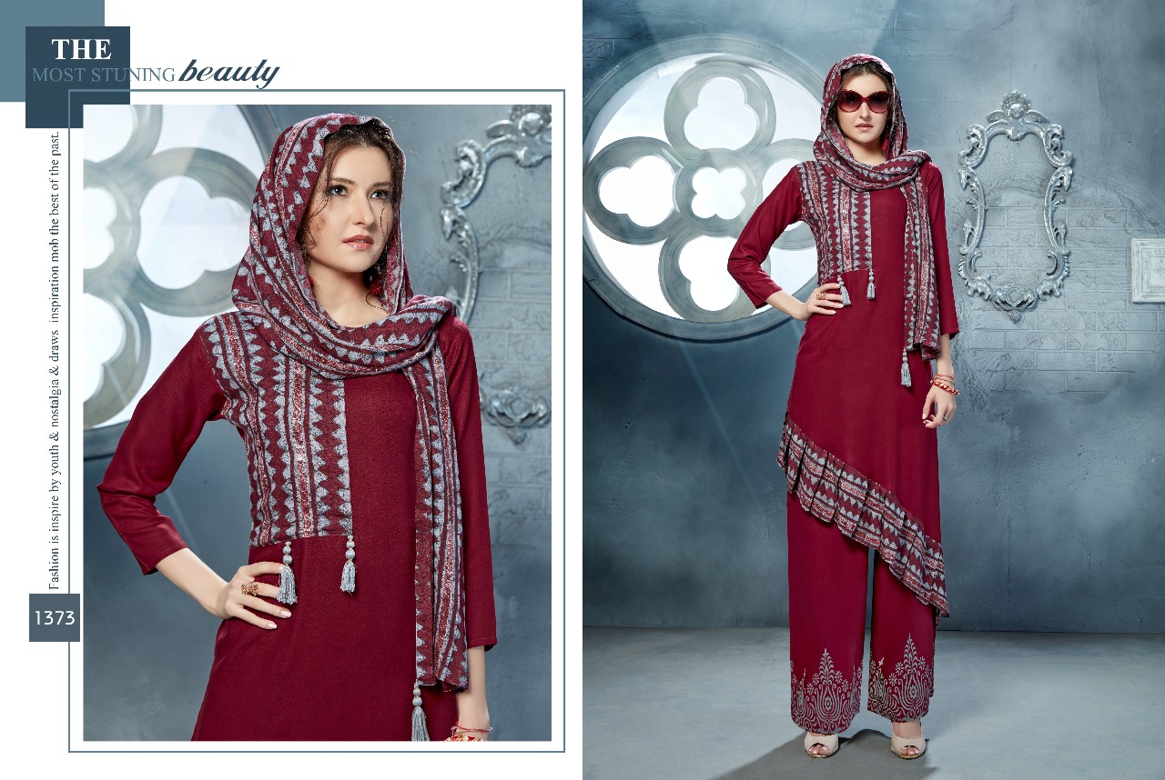 Vs Elliza 1371 Series Three Pieces Kurti Designer Reyon Kurti With Printed Plazo And Muffler Wholesale Price Surat Wholesale Dealer