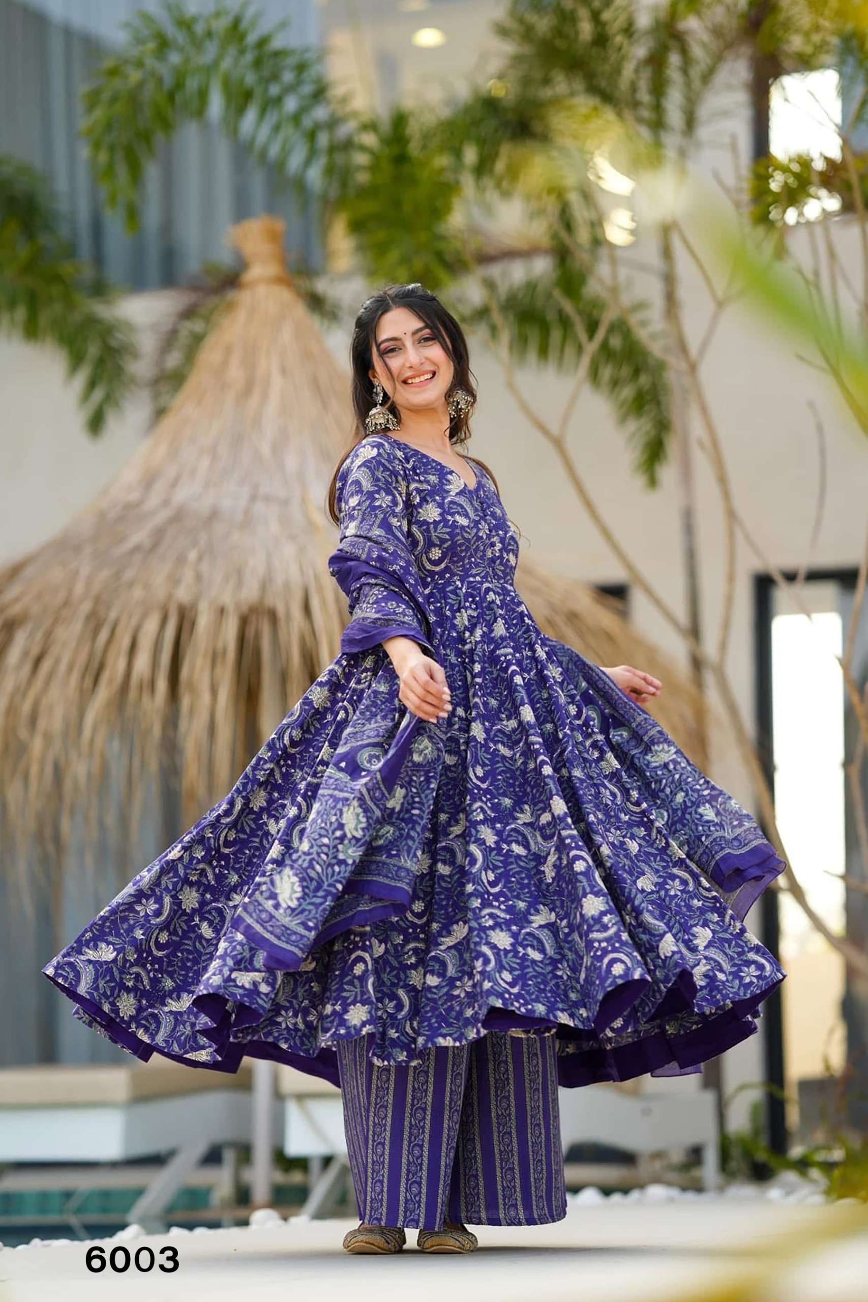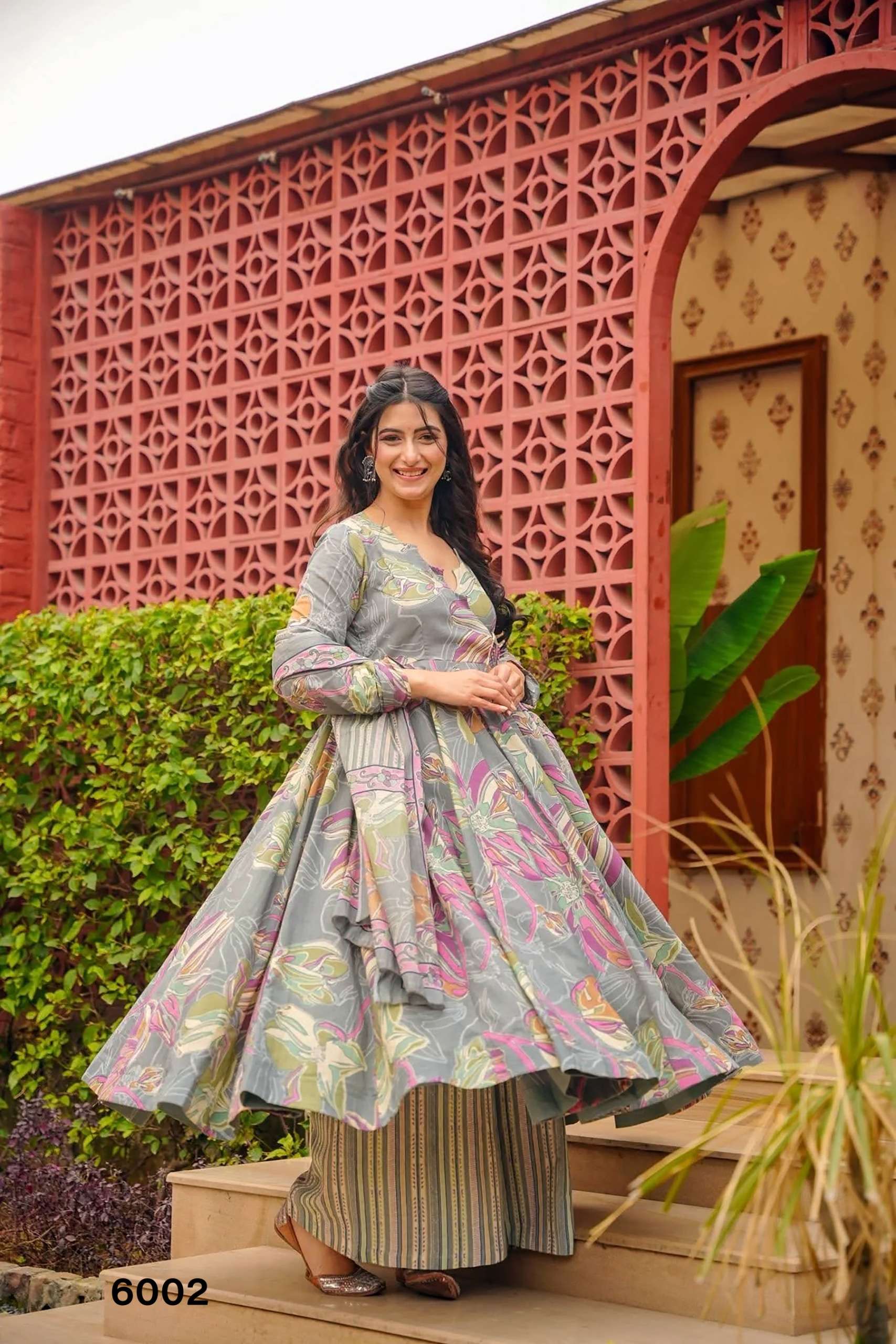 Kurta fabric : - Maslin with heavy digital print Kurta length :- up to 46-48”inch Flair :- 3.5 mtr approx