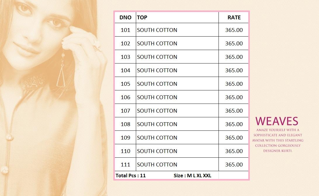 Buy Online Weaves By Lt Nitya 101 Series Fancy South Cotton Kurti Catlog Wholesale Dealer Surat 11 Pcs of Full Catalogue at Wholesale Price. Looking for Weaves By Lt Nitya 101 Series Fancy South Cotton Kurti Catlog Wholesale Dealer Surat Full Catalouge at Best Price? Buy Now Weaves By Lt Nitya 101 Series Fancy South Cotton Kurti Catlog Wholesale Dealer Surat at Wholesale Rate of Rs 4015 with Total 11 Pcs from authroized dealer and supplier of LT FABRICS Brand. Cost of Each piece is just only Rs 365 which is very low and affordable price to resale the product in your retail store ,This is Surat based Wholesale Supplier & Dealer of LT FABRICS Brand. Click on Brand name to Know more about LT FABRICS Brand's products.Call or Whatsapp on 9898838984 for booking or enquiry