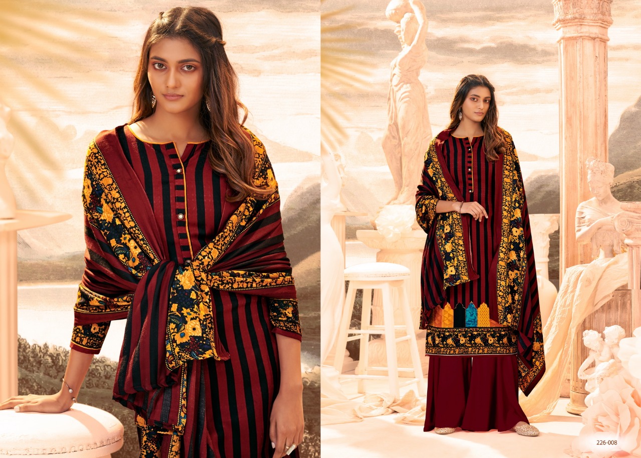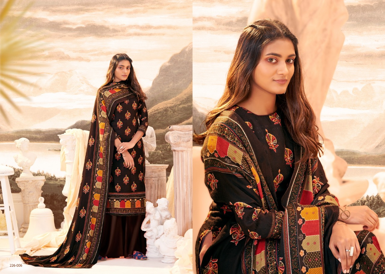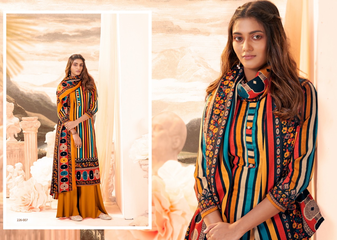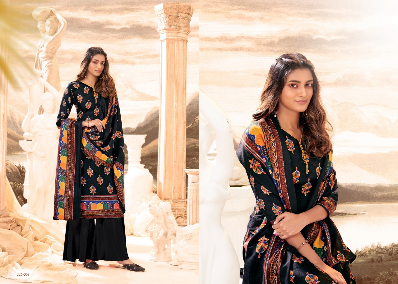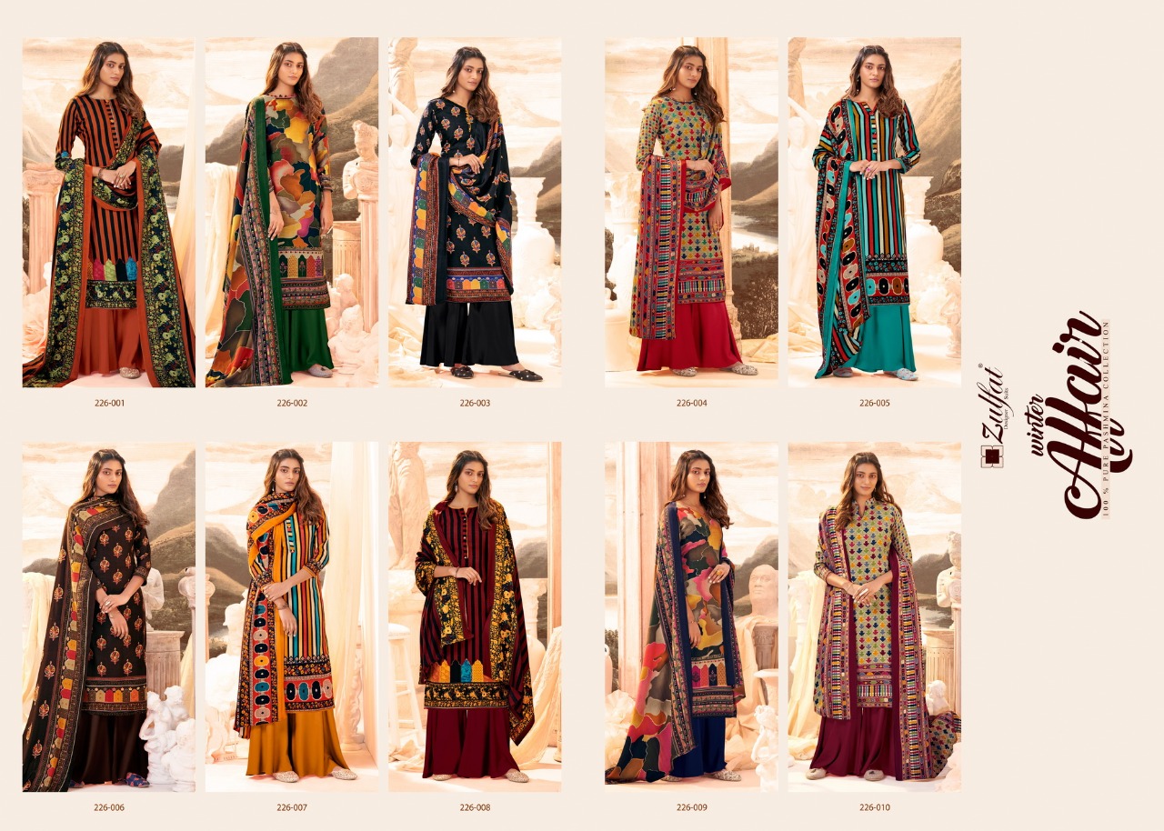 # Winter Affair # Pure Pashmina Collection *Â?Zulfat Designer SuitsÂ?* Presents *"WINTER AFFAIR"* _designer woollen collection_ VOL 3 ? Top: 100% Pure Pashmina Digital Style Print (2.50 mtrs) ? Dupatta: Pure Pashmina Shawl with four side lace (2.30 mtr) ? Bottom: Pure Pashmina Spun (3 mtrs apx) ?Pcs: 10 ?Rate: 395/- (GST extra) # Book Now |