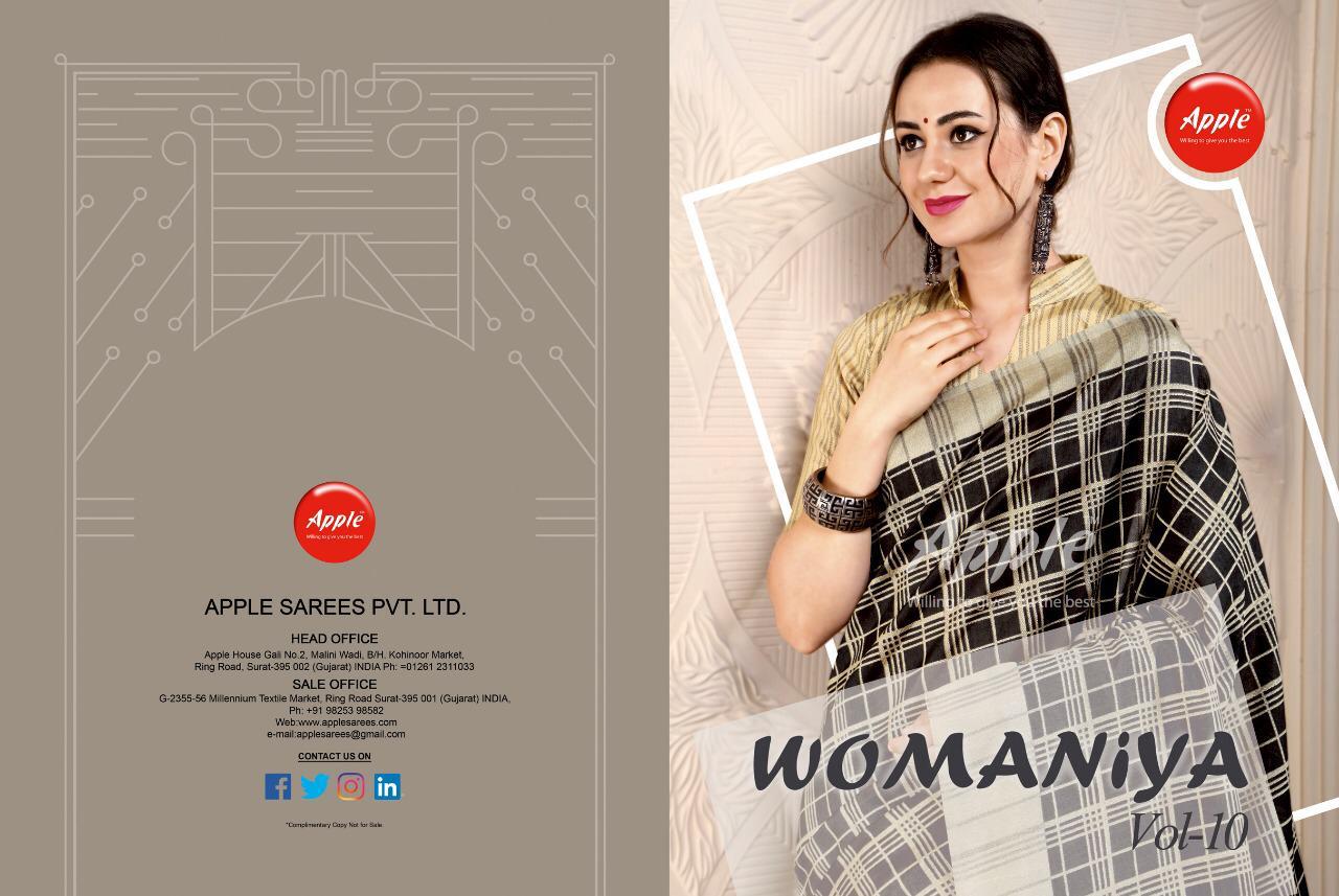 Buy Online Womaniya 10 By Apple Cotton Silk Printed Sarees Wholesale Supplier India 12 Pcs of Full Catalogue at Wholesale Price. Looking for Womaniya 10 By Apple Cotton Silk Printed Sarees Wholesale Supplier India Full Catalouge at Best Price? Buy Now Womaniya 10 By Apple Cotton Silk Printed Sarees Wholesale Supplier India at Wholesale Rate of Rs 4200 with Total 12 Pcs from authroized dealer and supplier of APPLE Brand. Cost of Each piece is just only Rs 350 which is very low and affordable price to resale the product in your retail store ,This is Surat based Wholesale Supplier & Dealer of APPLE Brand. Click on Brand name to Know more about APPLE Brand's products.Call or Whatsapp on 9898838984 for booking or enquiry