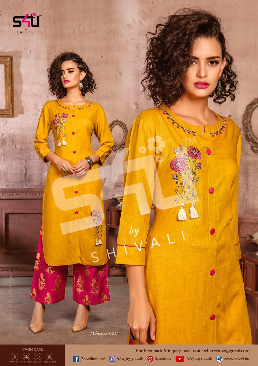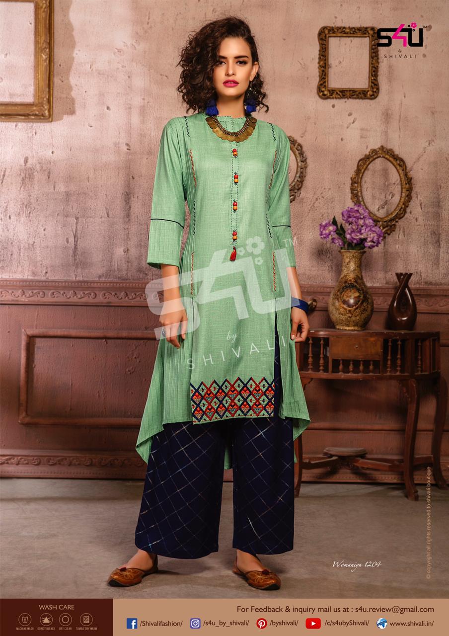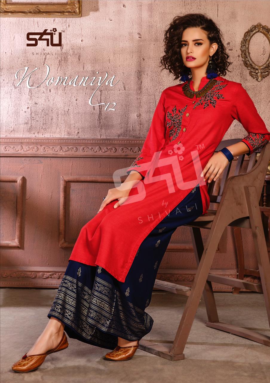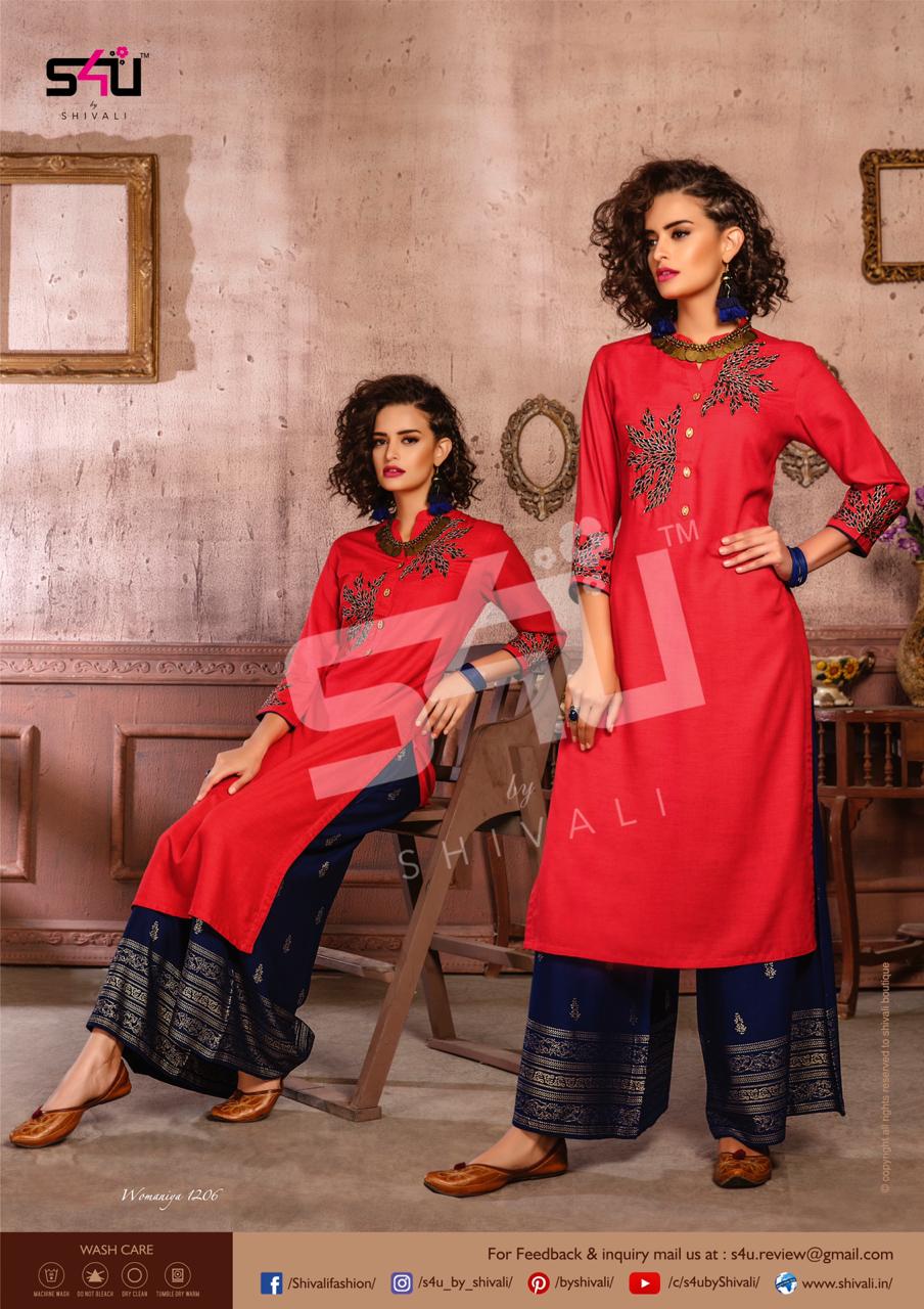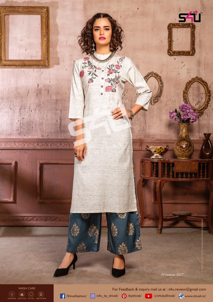 Such a comfy palazzo sets! Sometimes u just need a right pair of kurta & palazzo to beat this heat. S4U by Shivali launches Â? Womaniya vol. 12Â?. No. Of designs: 10 Sizes: M to 2xl Rate: 1099/- Dispatching in 2-3 days. GST 5% Only full |