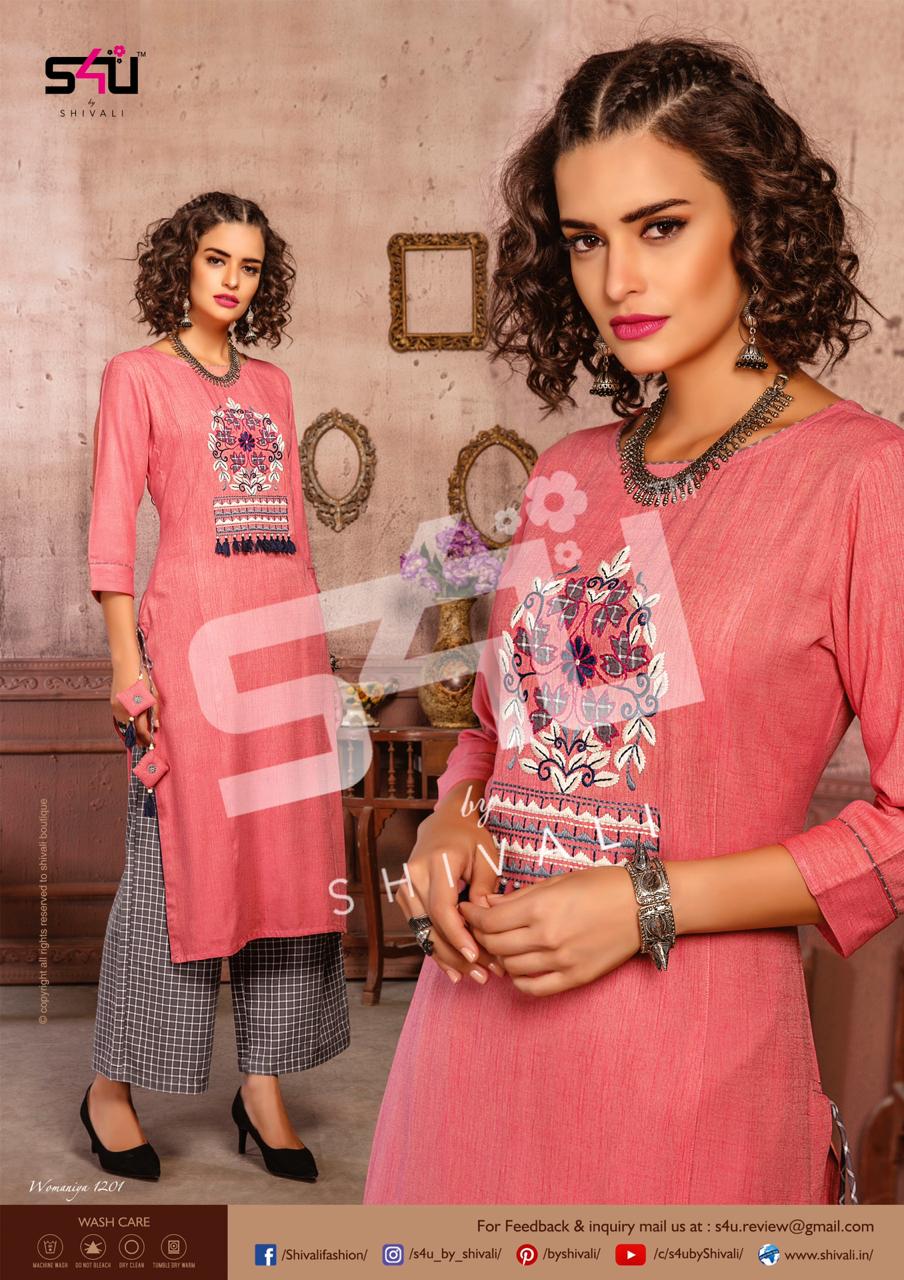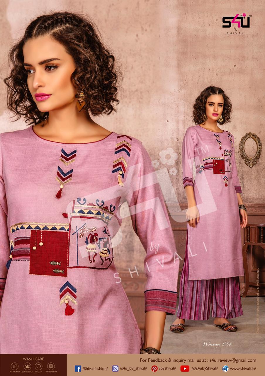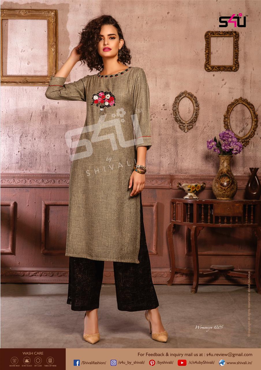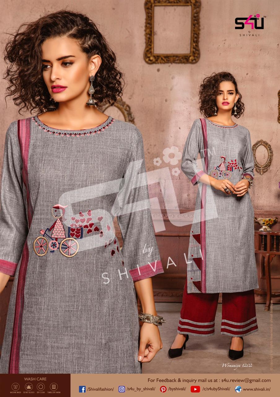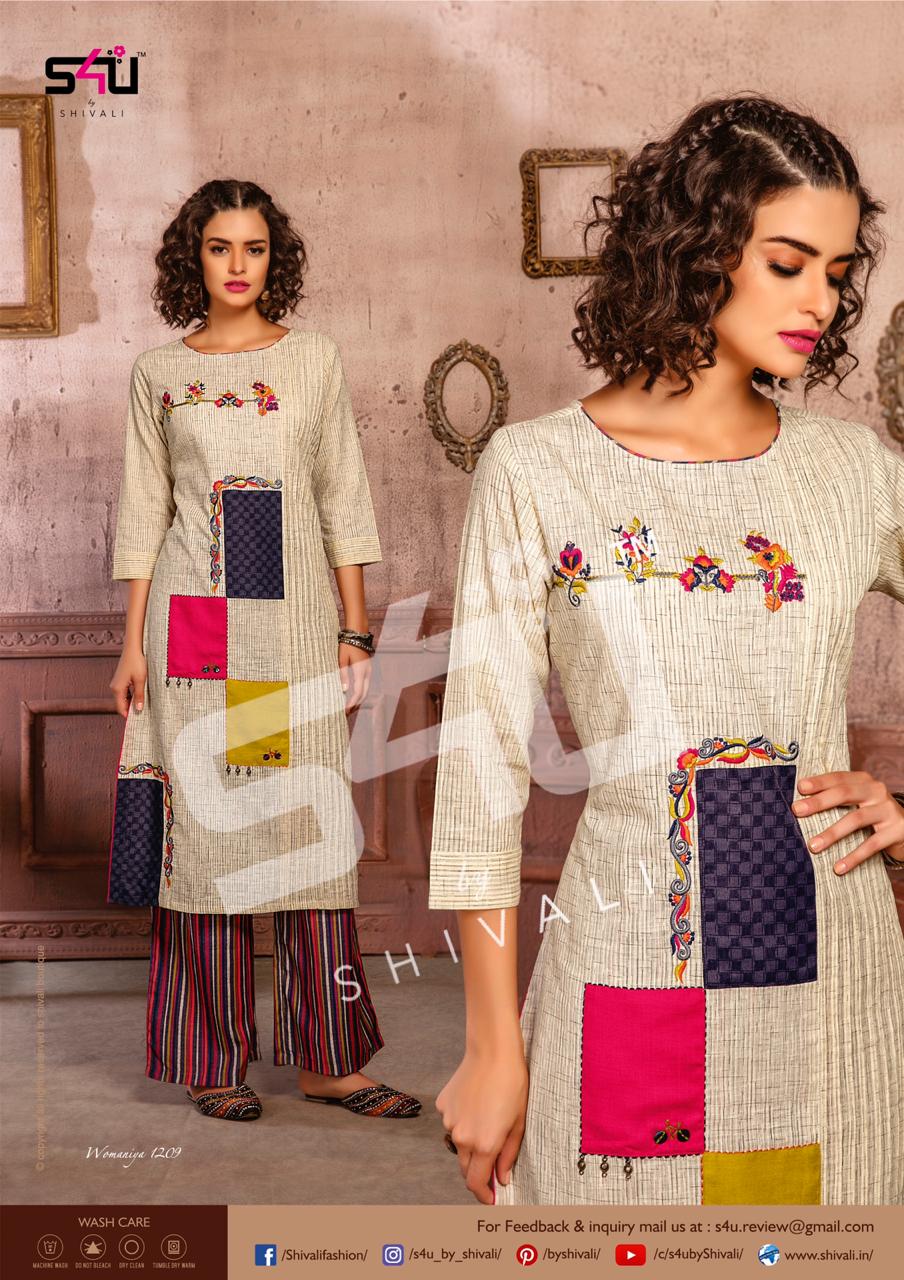 Such a comfy palazzo sets! Sometimes u just need a right pair of kurta & palazzo to beat this heat. S4U by Shivali launches Â? Womaniya vol. 12Â?. No. Of designs: 10 Sizes: M to 2xl Rate: 1099/- Dispatching in 2-3 days. GST 5% Only full |