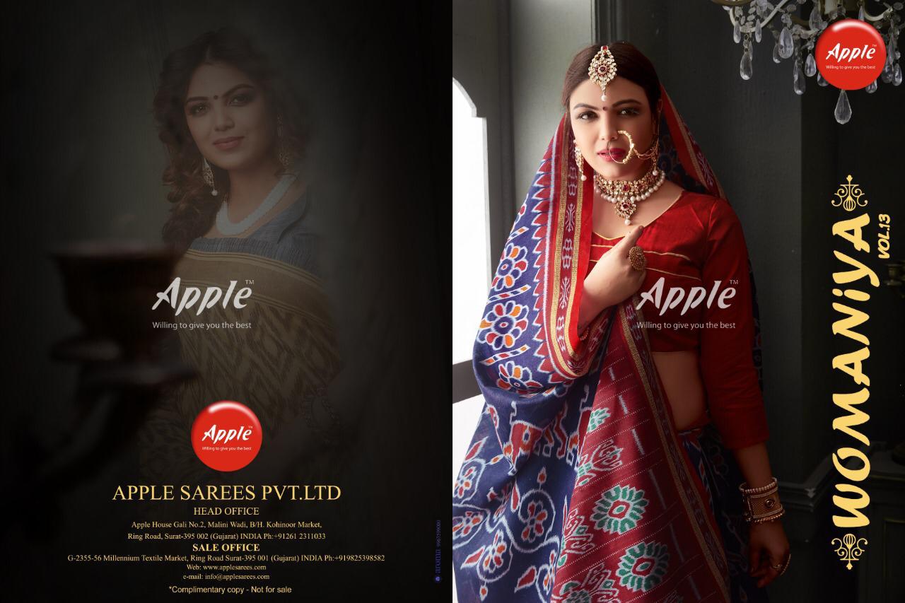 Buy Online Womaniya Vol 13 By Apple Cotton Silk Sarees Wholesale Supplier Gujarat 12 Pcs of Full Catalogue at Wholesale Price. Looking for Womaniya Vol 13 By Apple Cotton Silk Sarees Wholesale Supplier Gujarat Full Catalouge at Best Price? Buy Now Womaniya Vol 13 By Apple Cotton Silk Sarees Wholesale Supplier Gujarat at Wholesale Rate of Rs 4200 with Total 12 Pcs from authroized dealer and supplier of APPLE Brand. Cost of Each piece is just only Rs 350 which is very low and affordable price to resale the product in your retail store ,This is Surat based Wholesale Supplier & Dealer of APPLE Brand. Click on Brand name to Know more about APPLE Brand's products.Call or Whatsapp on 9898838984 for booking or enquiry