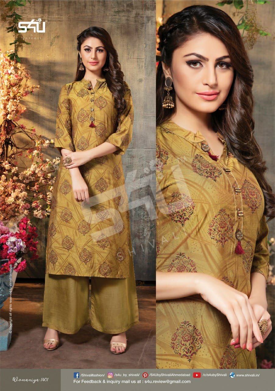 Buy Online Womaniya Vol 14 By S4u Shivali Designer Kurtis With Plazzo Wholesale Supplier Surat 6 Pcs of Full Catalogue at Wholesale Price. Looking for Womaniya Vol 14 By S4u Shivali Designer Kurtis With Plazzo Wholesale Supplier Surat Full Catalouge at Best Price? Buy Now Womaniya Vol 14 By S4u Shivali Designer Kurtis With Plazzo Wholesale Supplier Surat at Wholesale Rate of Rs 5670 with Total 6 Pcs from authroized dealer and supplier of S4U Brand. Cost of Each piece is just only Rs 945 which is very low and affordable price to resale the product in your retail store ,This is Surat based Wholesale Supplier & Dealer of S4U Brand. Click on Brand name to Know more about S4U Brand's products.Call or Whatsapp on 9898838984 for booking or enquiry