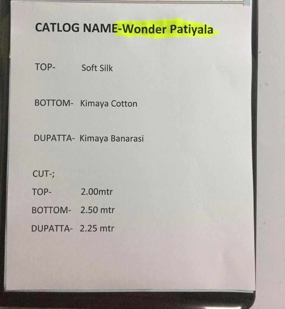 Brand - Vishnu Impex . Catlog name - Wonder Patiyala . Rate -675 per pcs . Set To set. GST 5 Percent Extra. Delivery 2 days |