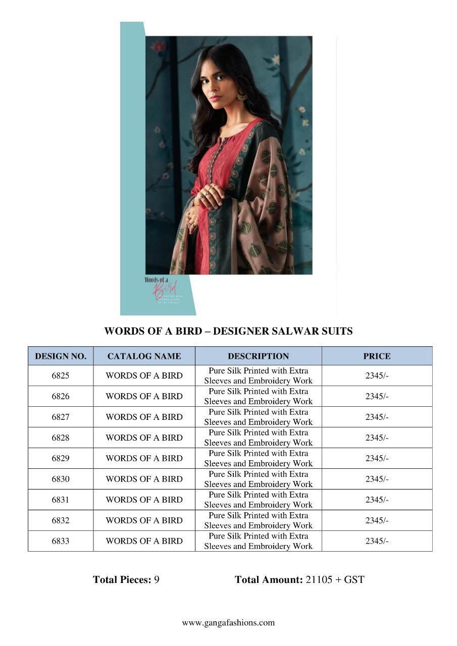 Buy Online Words Of A Bird By Ganga 6825 Series Fancy Pure Silk Printed Salwar Kameez Catlog Wholesale Dealer Surat 9 Pcs of Full Catalogue at Wholesale Price. Looking for Words Of A Bird By Ganga 6825 Series Fancy Pure Silk Printed Salwar Kameez Catlog Wholesale Dealer Surat Full Catalouge at Best Price? Buy Now Words Of A Bird By Ganga 6825 Series Fancy Pure Silk Printed Salwar Kameez Catlog Wholesale Dealer Surat at Wholesale Rate of Rs 21105 with Total 9 Pcs from authroized dealer and supplier of GANGA Brand. Cost of Each piece is just only Rs 2345 which is very low and affordable price to resale the product in your retail store ,This is Surat based Wholesale Supplier & Dealer of GANGA Brand. Click on Brand name to Know more about GANGA Brand's products.Call or Whatsapp on 9898838984 for booking or enquiry