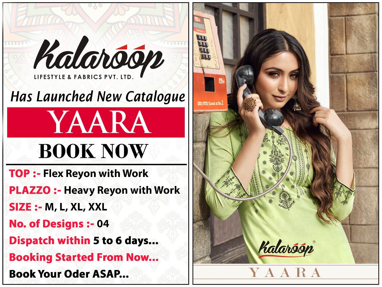 Buy Online Yaara By Kalaroop Kurtis With Bottom Wholesale Supplier And Dealer Surat 4 Pcs of Full Catalogue at Wholesale Price. Looking for Yaara By Kalaroop Kurtis With Bottom Wholesale Supplier And Dealer Surat Full Catalouge at Best Price? Buy Now Yaara By Kalaroop Kurtis With Bottom Wholesale Supplier And Dealer Surat at Wholesale Rate of Rs 0 with Total 4 Pcs from authroized dealer and supplier of Brand. Cost of Each piece is just only Rs 0 which is very low and affordable price to resale the product in your retail store ,This is Surat based Wholesale Supplier & Dealer of Brand. Click on Brand name to Know more about Brand's products.Call or Whatsapp on 9898838984 for booking or enquiry