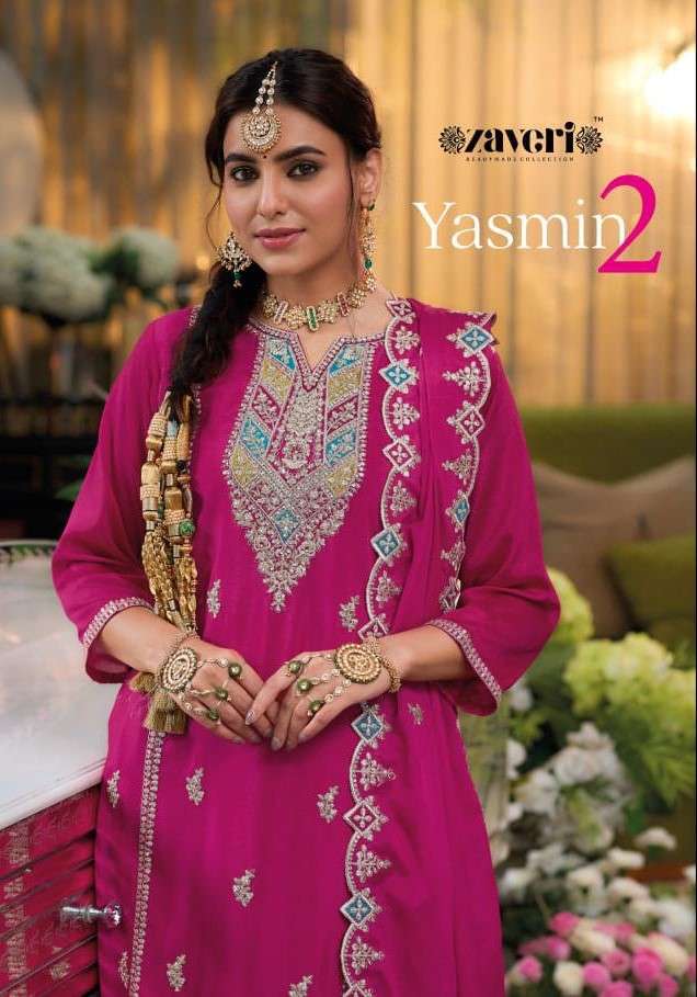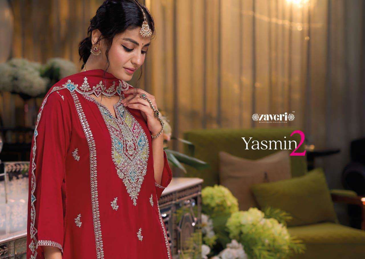 Yasmine vol-2 Top - hevey Chinon with emboidery work Duppta- hevey Chinon with embroidery Pant - Hevy silk SIZE :- M (38) L (40) XL (42) XXL (44) 3XL (46) BY - ZAVERI WOMAN BEAUTY |