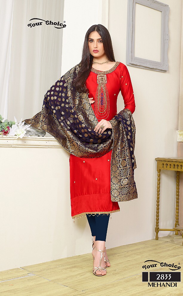 Buy Online Your Choice Mehandi Banarasi Dupatta Hand Work Suits Dealer 6 Pcs of Full Catalogue at Wholesale Price. Looking for Your Choice Mehandi Banarasi Dupatta Hand Work Suits Dealer Full Catalouge at Best Price? Buy Now Your Choice Mehandi Banarasi Dupatta Hand Work Suits Dealer at Wholesale Rate of Rs 6570 with Total 6 Pcs from authroized dealer and supplier of YOUR CHOICE Brand. Cost of Each piece is just only Rs 1095 which is very low and affordable price to resale the product in your retail store ,This is Surat based Wholesale Supplier & Dealer of YOUR CHOICE Brand. Click on Brand name to Know more about YOUR CHOICE Brand's products.Call or Whatsapp on 9898838984 for booking or enquiry