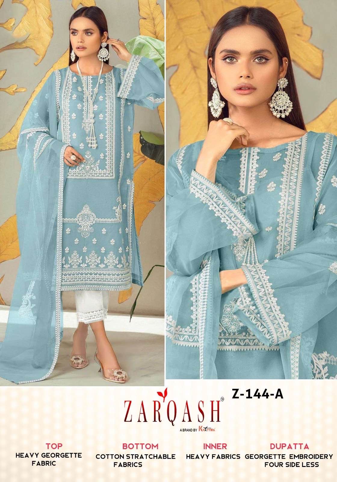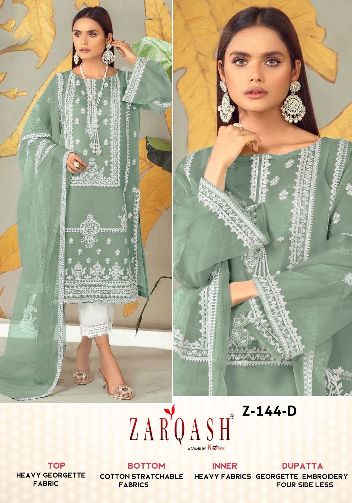Buy Online Z 144 By Zarqash Readymade Collection 4 Pcs of Full Catalogue at Wholesale Price. Looking for Z 144 By Zarqash Readymade Collection Full Catalouge at Best Price? Buy Now Z 144 By Zarqash Readymade Collection at Wholesale Rate of Rs 5000 with Total 4 Pcs from authroized dealer and supplier of Brand. Cost of Each piece is just only Rs 1250 which is very low and affordable price to resale the product in your retail store ,This is Surat based Wholesale Supplier & Dealer of Brand. Click on Brand name to Know more about Brand's products.Call or Whatsapp on 9898838984 for booking or enquiry