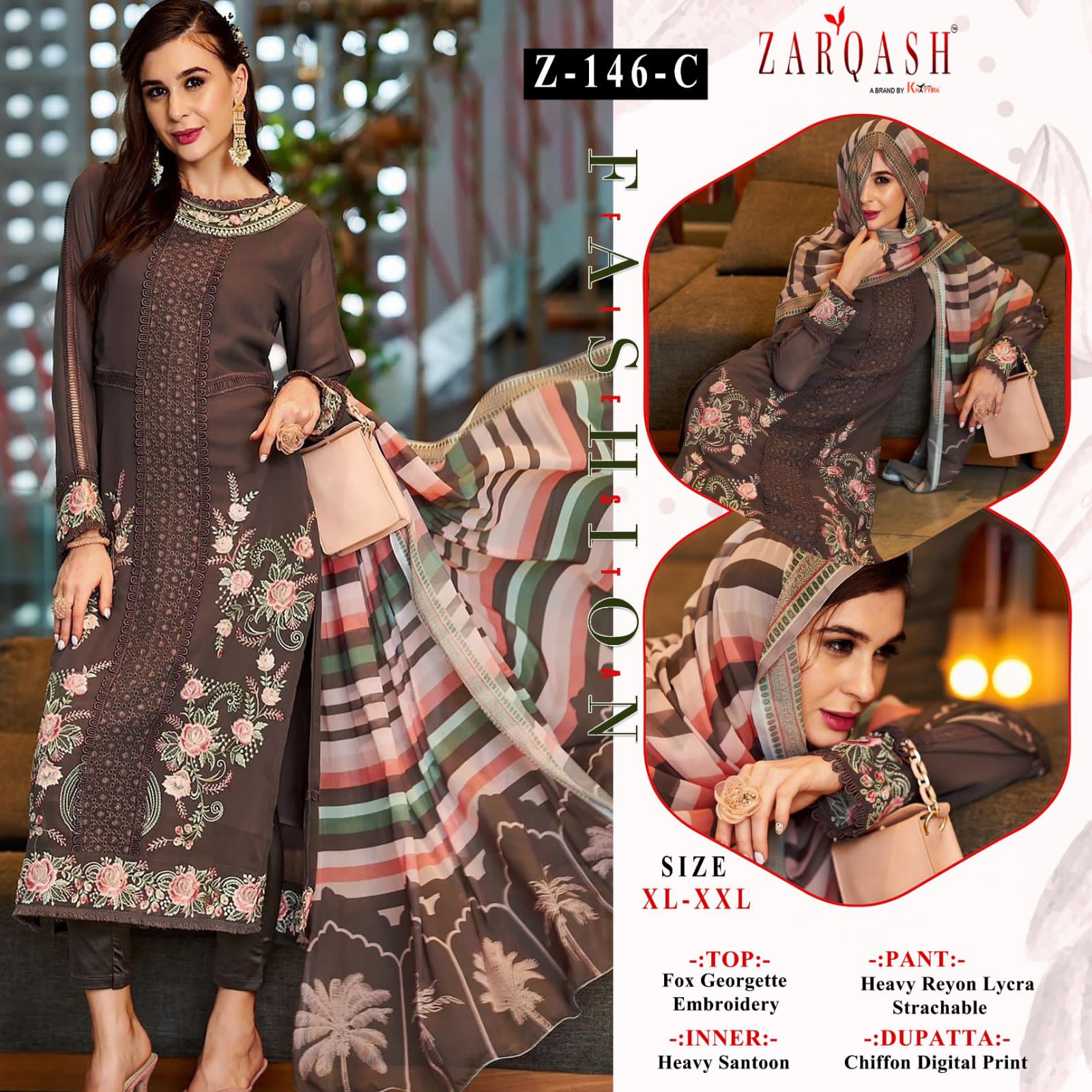 Buy Online Z 146 Zarqash Readymade Collection 3 Pcs of Full Catalogue at Wholesale Price. Looking for Z 146 Zarqash Readymade Collection Full Catalouge at Best Price? Buy Now Z 146 Zarqash Readymade Collection at Wholesale Rate of Rs 4350 with Total 3 Pcs from authroized dealer and supplier of Brand. Cost of Each piece is just only Rs 1450 which is very low and affordable price to resale the product in your retail store ,This is Surat based Wholesale Supplier & Dealer of Brand. Click on Brand name to Know more about Brand's products.Call or Whatsapp on 9898838984 for booking or enquiry