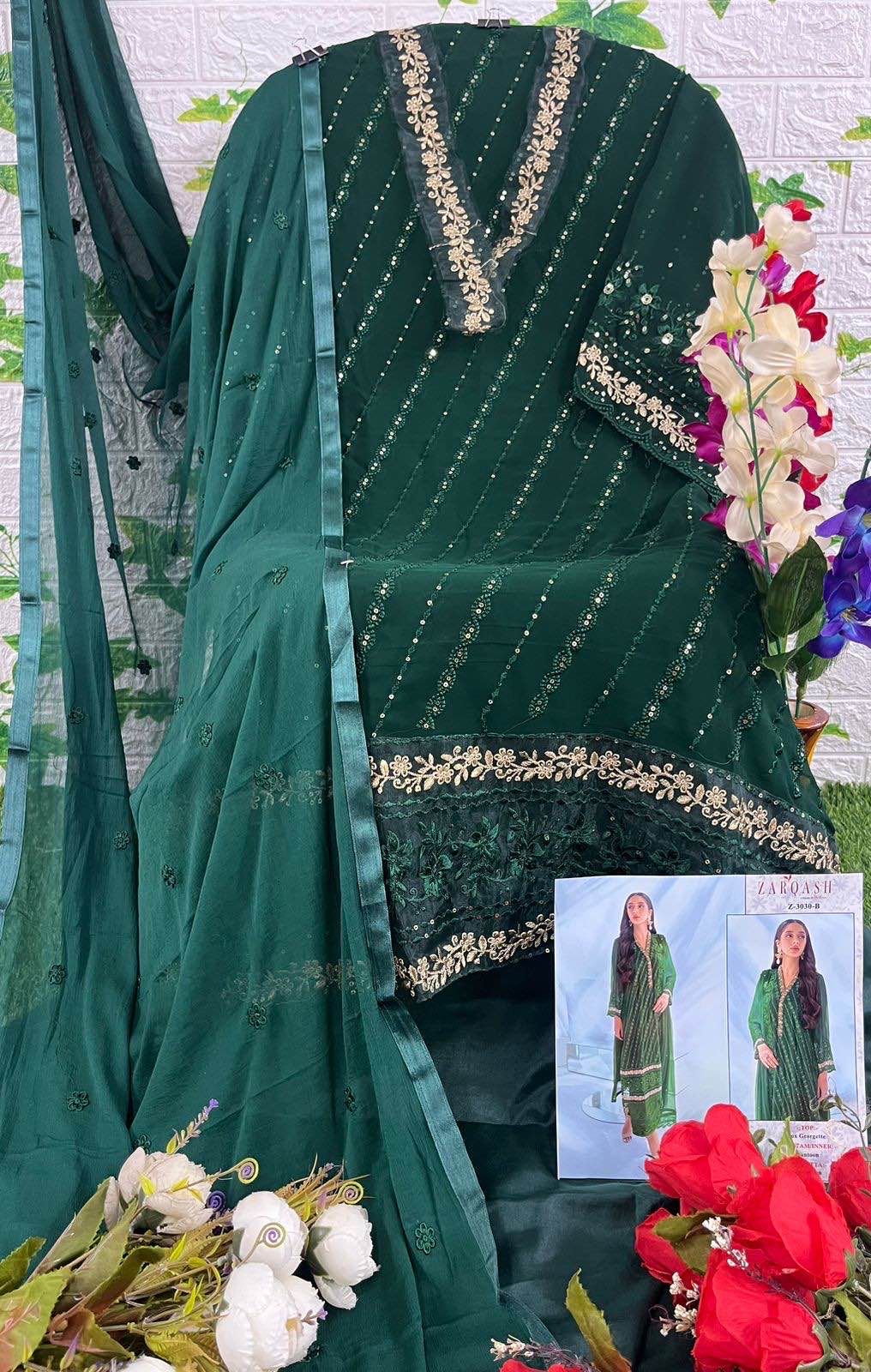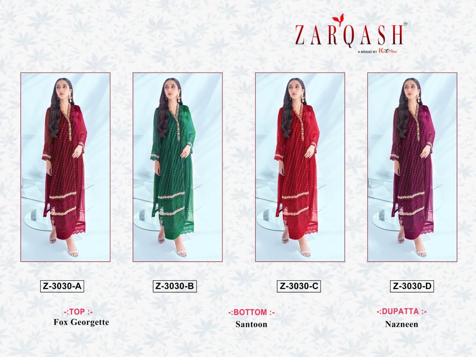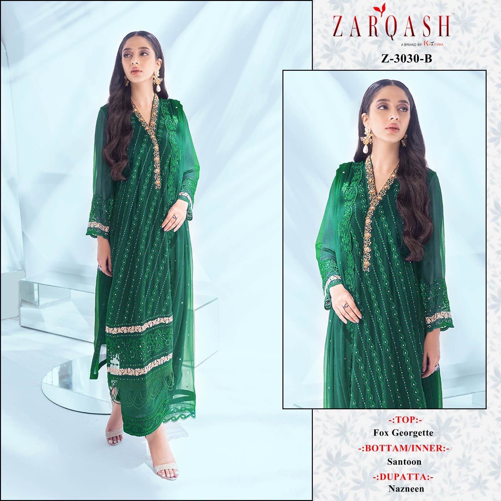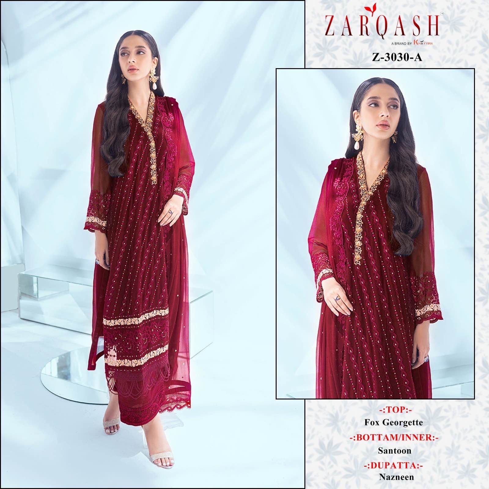 Buy Online Z 3030 Pakistani Suit By Zarqash India 4 Pcs of Full Catalogue at Wholesale Price. Looking for Z 3030 Pakistani Suit By Zarqash India Full Catalouge at Best Price? Buy Now Z 3030 Pakistani Suit By Zarqash India at Wholesale Rate of Rs 3596 with Total 4 Pcs from authroized dealer and supplier of Brand. Cost of Each piece is just only Rs 899 which is very low and affordable price to resale the product in your retail store ,This is Surat based Wholesale Supplier & Dealer of Brand. Click on Brand name to Know more about Brand's products.Call or Whatsapp on 9898838984 for booking or enquiry