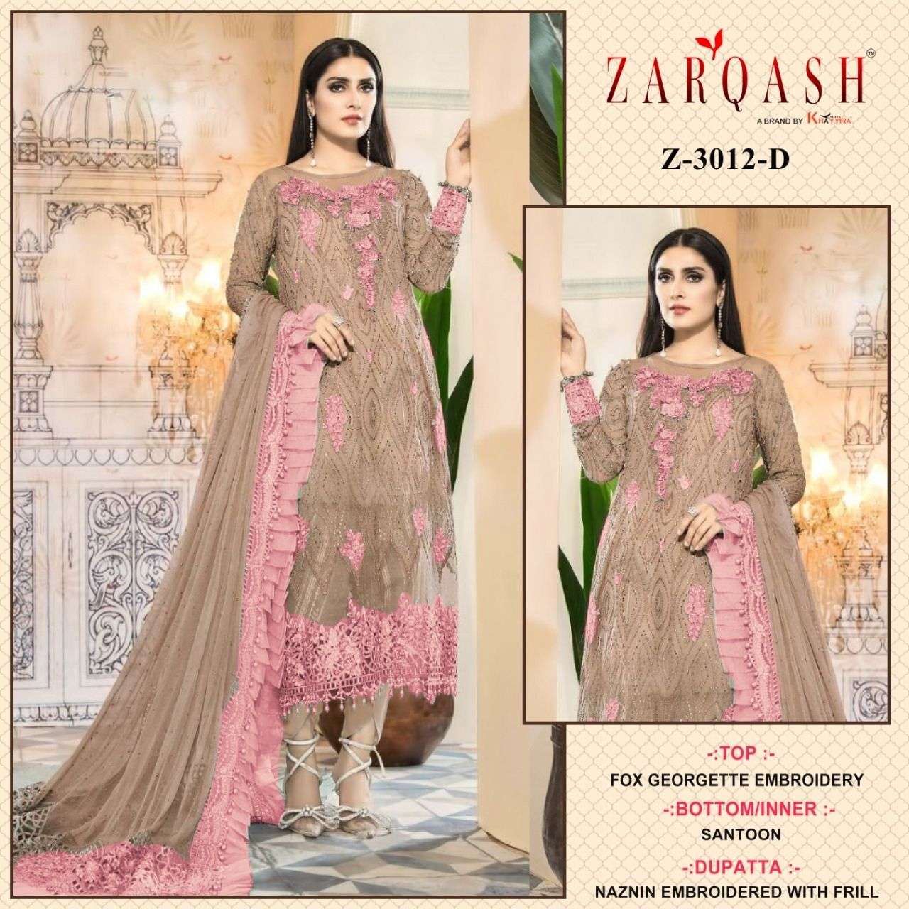 Buy Online Z D NO 3012 BCD BY ZARQASH GEORGETTE PAKISTANI SUITS 3 Pcs of Full Catalogue at Wholesale Price. Looking for Z D NO 3012 BCD BY ZARQASH GEORGETTE PAKISTANI SUITS Full Catalouge at Best Price? Buy Now Z D NO 3012 BCD BY ZARQASH GEORGETTE PAKISTANI SUITS at Wholesale Rate of Rs 3300 with Total 3 Pcs from authroized dealer and supplier of ZARQASH Brand. Cost of Each piece is just only Rs 1100 which is very low and affordable price to resale the product in your retail store ,This is Surat based Wholesale Supplier & Dealer of ZARQASH Brand. Click on Brand name to Know more about ZARQASH Brand's products.Call or Whatsapp on 9898838984 for booking or enquiry