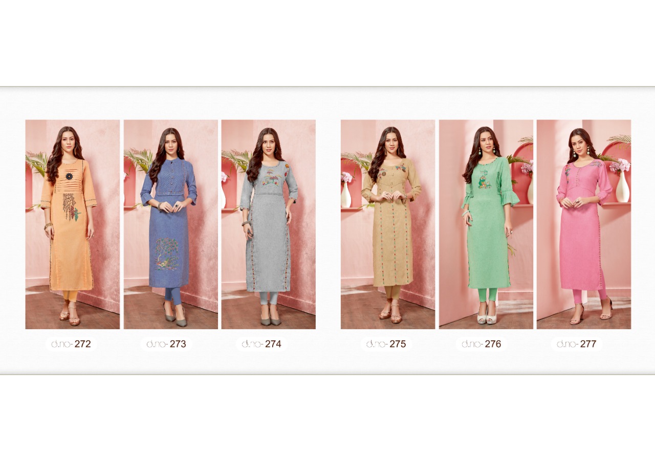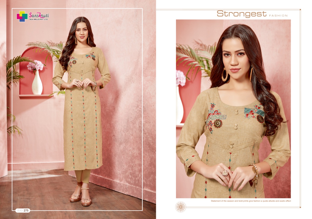 Buy Online Zahira By Sanskruti Silk Mills 272 Series Fancy Pure Linen Cotton Kurti Catlog Wholesaler Surat 6 Pcs of Full Catalogue at Wholesale Price. Looking for Zahira By Sanskruti Silk Mills 272 Series Fancy Pure Linen Cotton Kurti Catlog Wholesaler Surat Full Catalouge at Best Price? Buy Now Zahira By Sanskruti Silk Mills 272 Series Fancy Pure Linen Cotton Kurti Catlog Wholesaler Surat at Wholesale Rate of Rs 3570 with Total 6 Pcs from authroized dealer and supplier of Sanskruti Brand. Cost of Each piece is just only Rs 595 which is very low and affordable price to resale the product in your retail store ,This is Surat based Wholesale Supplier & Dealer of Sanskruti Brand. Click on Brand name to Know more about Sanskruti Brand's products.Call or Whatsapp on 9898838984 for booking or enquiry