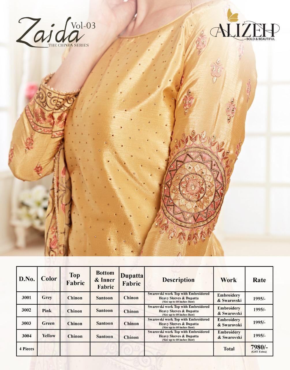 Buy Online Zaida Vol 3 By Alizeh Official Series 3001 Designer Occasion Wear Suits Set And Single Wholesale Supplier Gujarat 4 Pcs of Full Catalogue at Wholesale Price. Looking for Zaida Vol 3 By Alizeh Official Series 3001 Designer Occasion Wear Suits Set And Single Wholesale Supplier Gujarat Full Catalouge at Best Price? Buy Now Zaida Vol 3 By Alizeh Official Series 3001 Designer Occasion Wear Suits Set And Single Wholesale Supplier Gujarat at Wholesale Rate of Rs 7980 with Total 4 Pcs from authroized dealer and supplier of Brand. Cost of Each piece is just only Rs 1995 which is very low and affordable price to resale the product in your retail store ,This is Surat based Wholesale Supplier & Dealer of Brand. Click on Brand name to Know more about Brand's products.Call or Whatsapp on 9898838984 for booking or enquiry