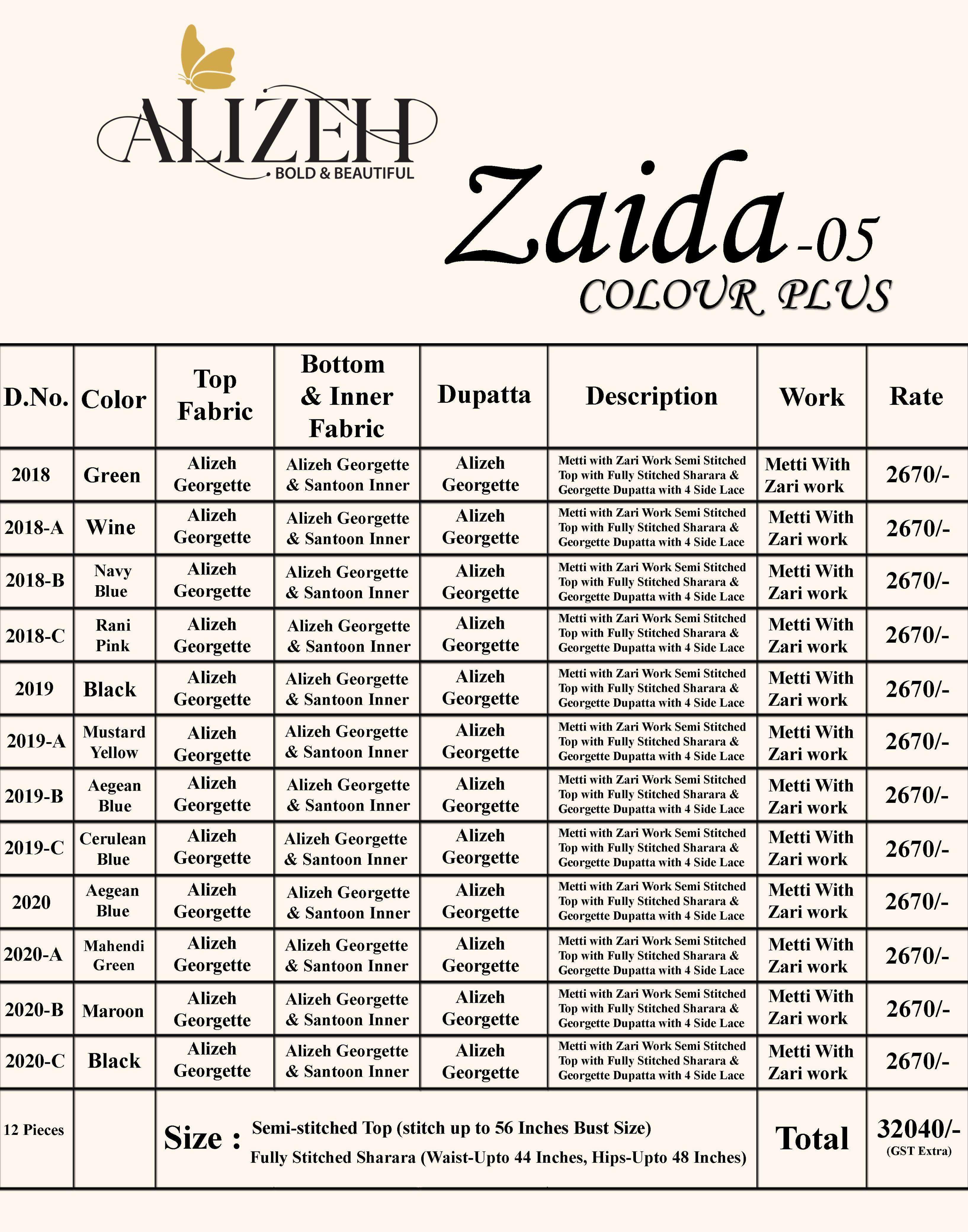 Buy Online Zaida Vol 5 Colour Plus by Alizeh Top Dupatta Sharara suit collection manufacturer surat 5 Pcs of Full Catalogue at Wholesale Price. Looking for Zaida Vol 5 Colour Plus by Alizeh Top Dupatta Sharara suit collection manufacturer surat Full Catalouge at Best Price? Buy Now Zaida Vol 5 Colour Plus by Alizeh Top Dupatta Sharara suit collection manufacturer surat at Wholesale Rate of Rs 13350 with Total 5 Pcs from authroized dealer and supplier of Alizeh Official Brand. Cost of Each piece is just only Rs 2670 which is very low and affordable price to resale the product in your retail store ,This is Surat based Wholesale Supplier & Dealer of Alizeh Official Brand. Click on Brand name to Know more about Alizeh Official Brand's products.Call or Whatsapp on 9898838984 for booking or enquiry