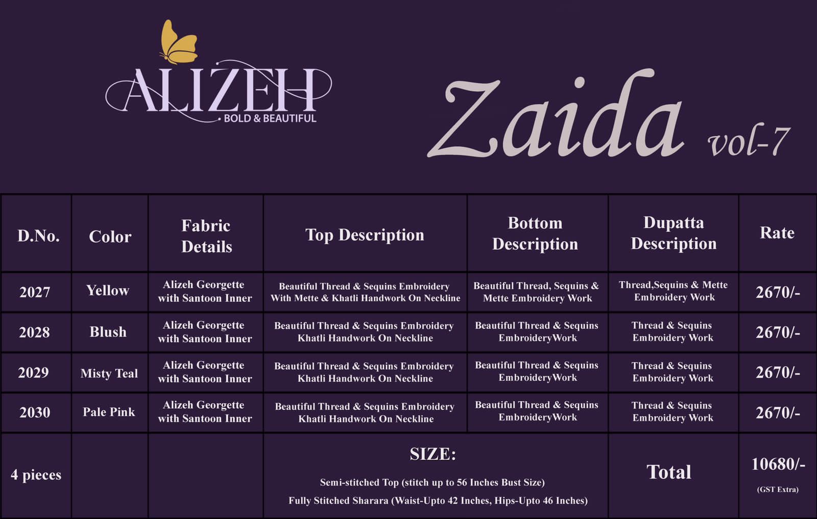 Buy Online Zaida Vol 7 Series 2027 To 2030 By Alizeh Official Single And Set Stockiest And Supplier From Surat 4 Pcs of Full Catalogue at Wholesale Price. Looking for Zaida Vol 7 Series 2027 To 2030 By Alizeh Official Single And Set Stockiest And Supplier From Surat Full Catalouge at Best Price? Buy Now Zaida Vol 7 Series 2027 To 2030 By Alizeh Official Single And Set Stockiest And Supplier From Surat at Wholesale Rate of Rs 10680 with Total 4 Pcs from authroized dealer and supplier of Brand. Cost of Each piece is just only Rs 2670 which is very low and affordable price to resale the product in your retail store ,This is Surat based Wholesale Supplier & Dealer of Brand. Click on Brand name to Know more about Brand's products.Call or Whatsapp on 9898838984 for booking or enquiry