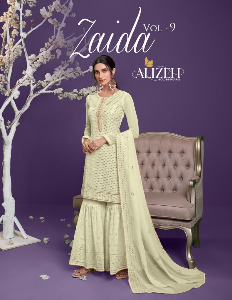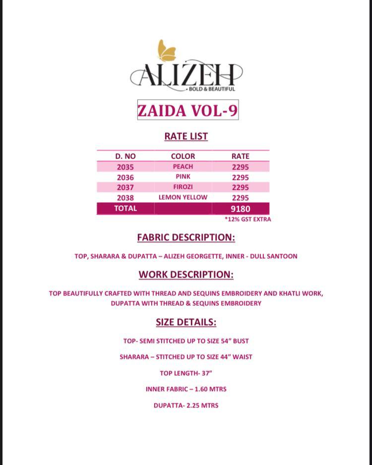 Buy Online Zaida Vol 9 By Alizeh Official Presenting Premium Sharara Collection 4 Pcs of Full Catalogue at Wholesale Price. Looking for Zaida Vol 9 By Alizeh Official Presenting Premium Sharara Collection Full Catalouge at Best Price? Buy Now Zaida Vol 9 By Alizeh Official Presenting Premium Sharara Collection at Wholesale Rate of Rs 9180 with Total 4 Pcs from authroized dealer and supplier of Brand. Cost of Each piece is just only Rs 2295 which is very low and affordable price to resale the product in your retail store ,This is Surat based Wholesale Supplier & Dealer of Brand. Click on Brand name to Know more about Brand's products.Call or Whatsapp on 9898838984 for booking or enquiry