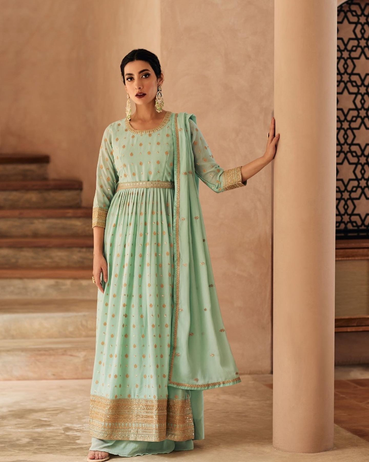 AASHIRWAD CREATION PRESENT NEW FREE SIZE STITCH COLLECTION (XL SIZE ) ??Zara ?? ?FABRIC DETAILS !!!! TOP-CHINNON N REAL GEORGETTE (free size stitch ) PLAZZO-CHINNON N REAL GEORGETTE (FREE SIZE STITCH) DUPTTA- CHINNON N REAL GEORGETTE Price - 2399 Gst - 12 percent extra Dispatching in 3 days !!! 100+single |