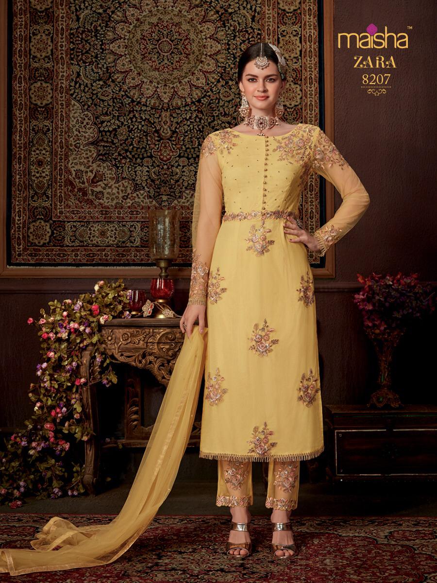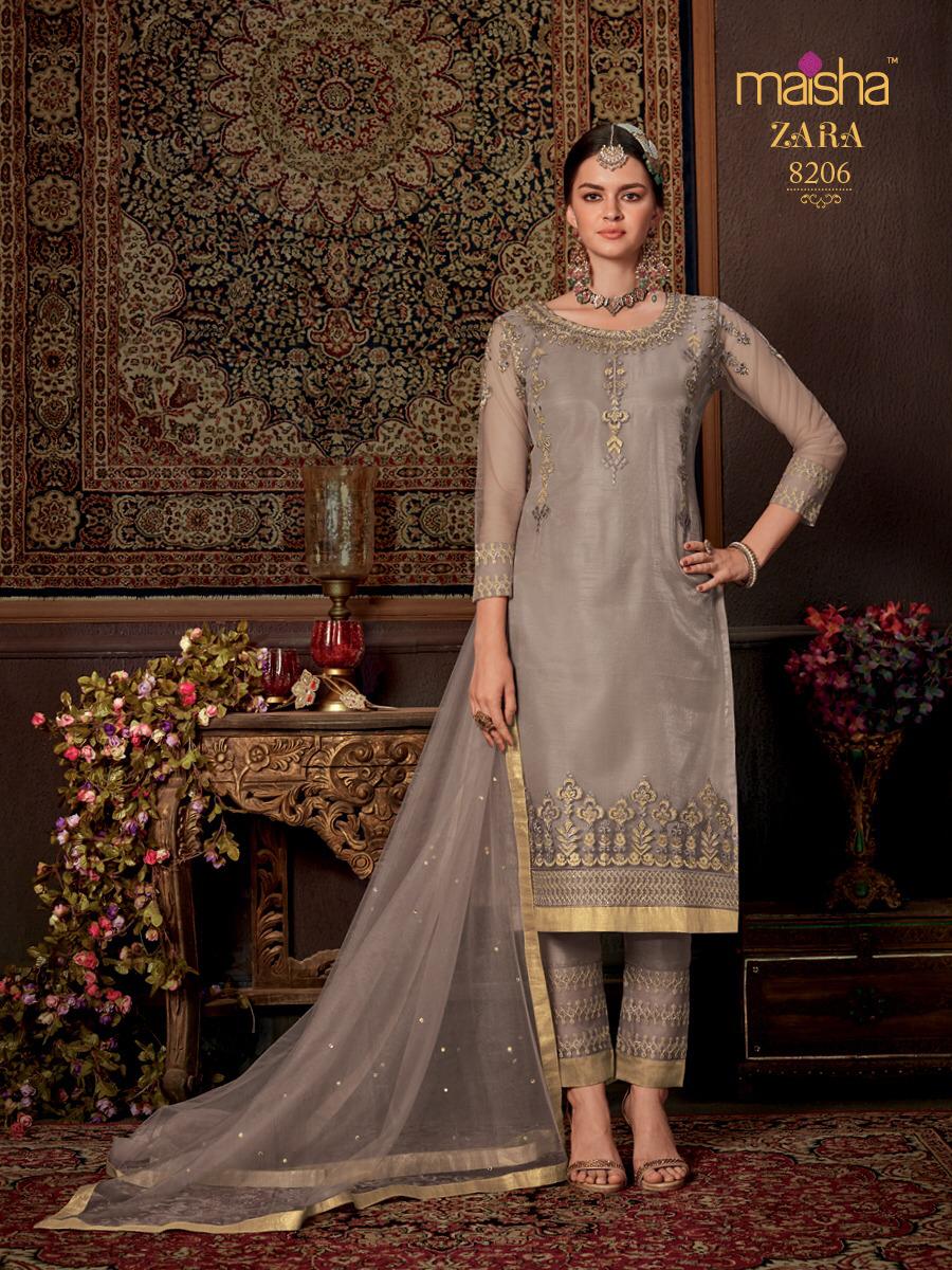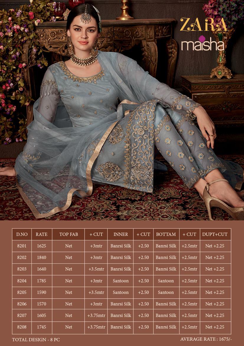 Buy Online Zara By Maisha Maskeen Series 8201 To 8208 Designer Party Wear Suits Set And Single Wholesale Supplier Gujarat 8 Pcs of Full Catalogue at Wholesale Price. Looking for Zara By Maisha Maskeen Series 8201 To 8208 Designer Party Wear Suits Set And Single Wholesale Supplier Gujarat Full Catalouge at Best Price? Buy Now Zara By Maisha Maskeen Series 8201 To 8208 Designer Party Wear Suits Set And Single Wholesale Supplier Gujarat at Wholesale Rate of Rs 13400 with Total 8 Pcs from authroized dealer and supplier of MAISHA Brand. Cost of Each piece is just only Rs 1675 which is very low and affordable price to resale the product in your retail store ,This is Surat based Wholesale Supplier & Dealer of MAISHA Brand. Click on Brand name to Know more about MAISHA Brand's products.Call or Whatsapp on 9898838984 for booking or enquiry
