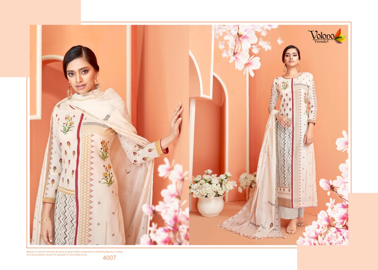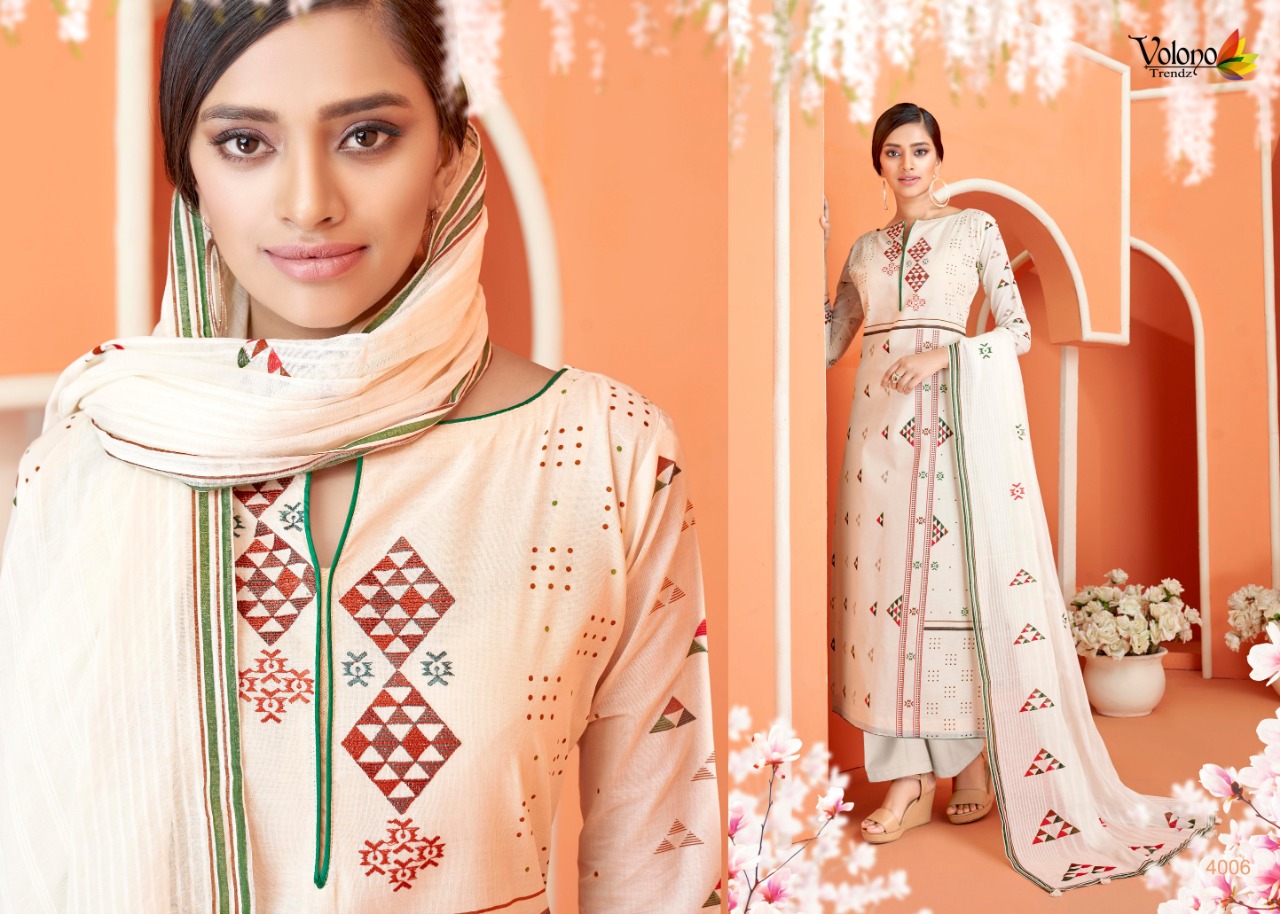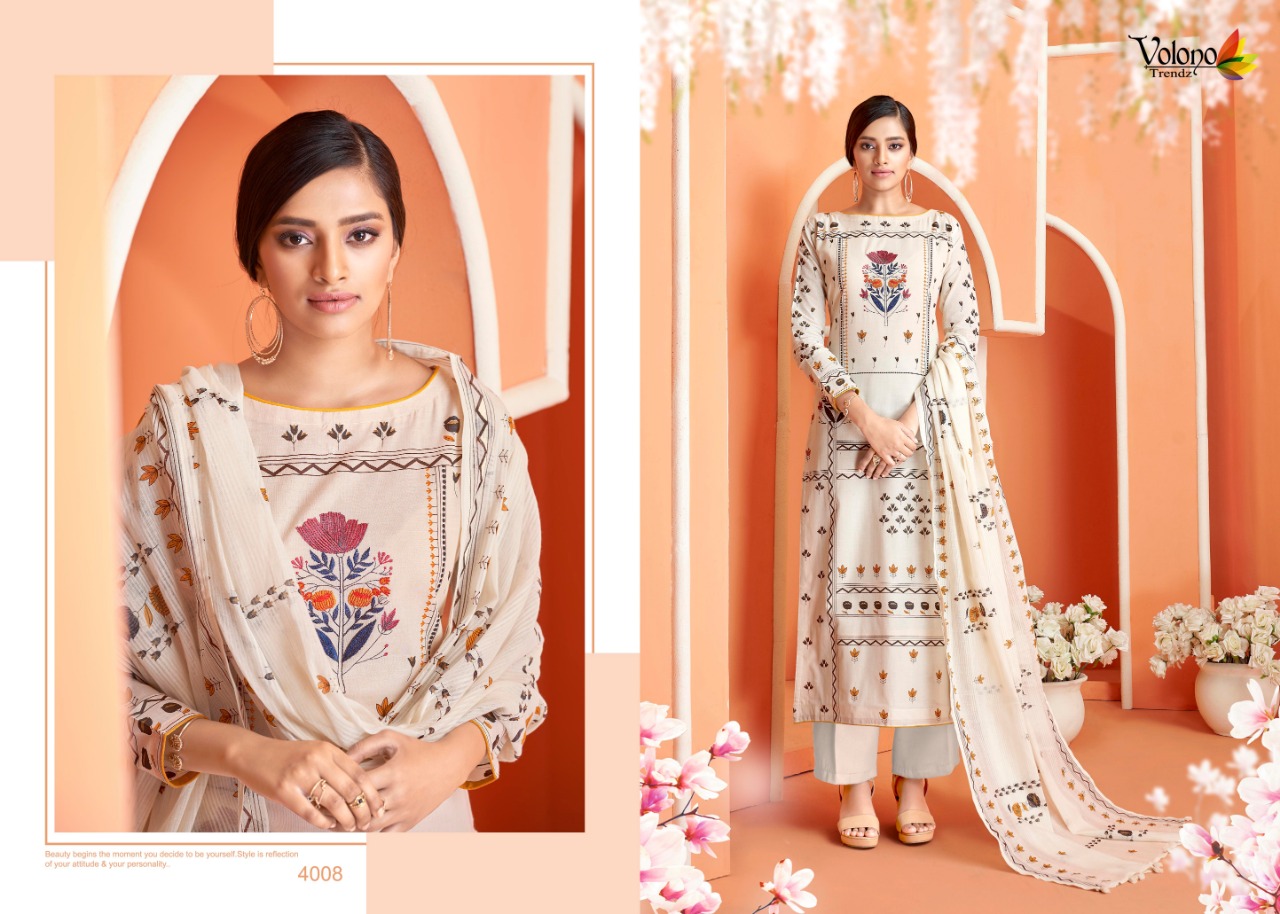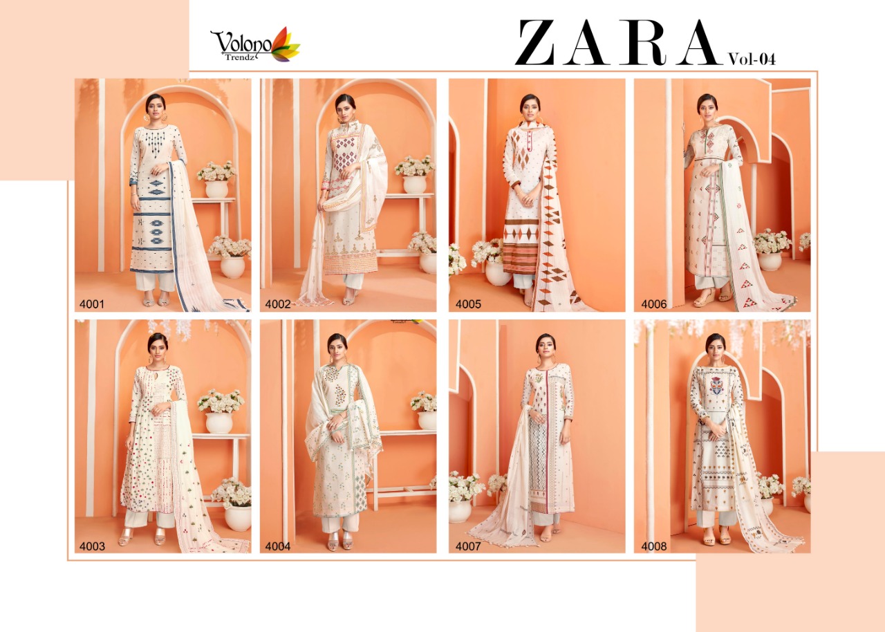 Buy Online Zara Vol 4 By Volono Trendz Cambric Cotton Embroidered Designer Suits Wholesale Supplier Gujarat 8 Pcs of Full Catalogue at Wholesale Price. Looking for Zara Vol 4 By Volono Trendz Cambric Cotton Embroidered Designer Suits Wholesale Supplier Gujarat Full Catalouge at Best Price? Buy Now Zara Vol 4 By Volono Trendz Cambric Cotton Embroidered Designer Suits Wholesale Supplier Gujarat at Wholesale Rate of Rs 5560 with Total 8 Pcs from authroized dealer and supplier of VOLONO TRENDZ Brand. Cost of Each piece is just only Rs 695 which is very low and affordable price to resale the product in your retail store ,This is Surat based Wholesale Supplier & Dealer of VOLONO TRENDZ Brand. Click on Brand name to Know more about VOLONO TRENDZ Brand's products.Call or Whatsapp on 9898838984 for booking or enquiry