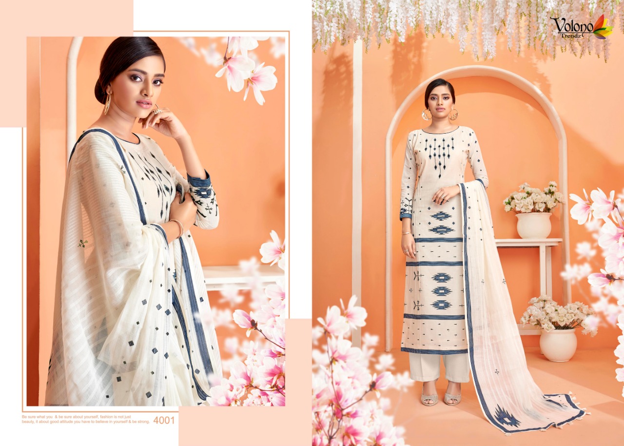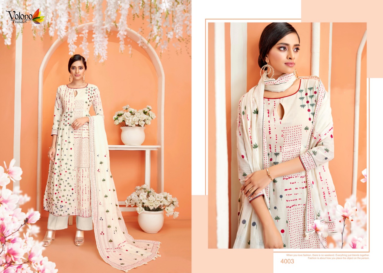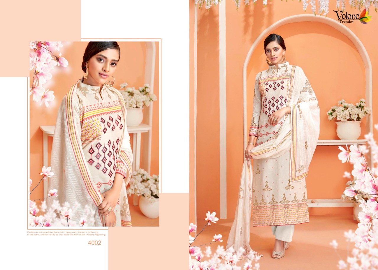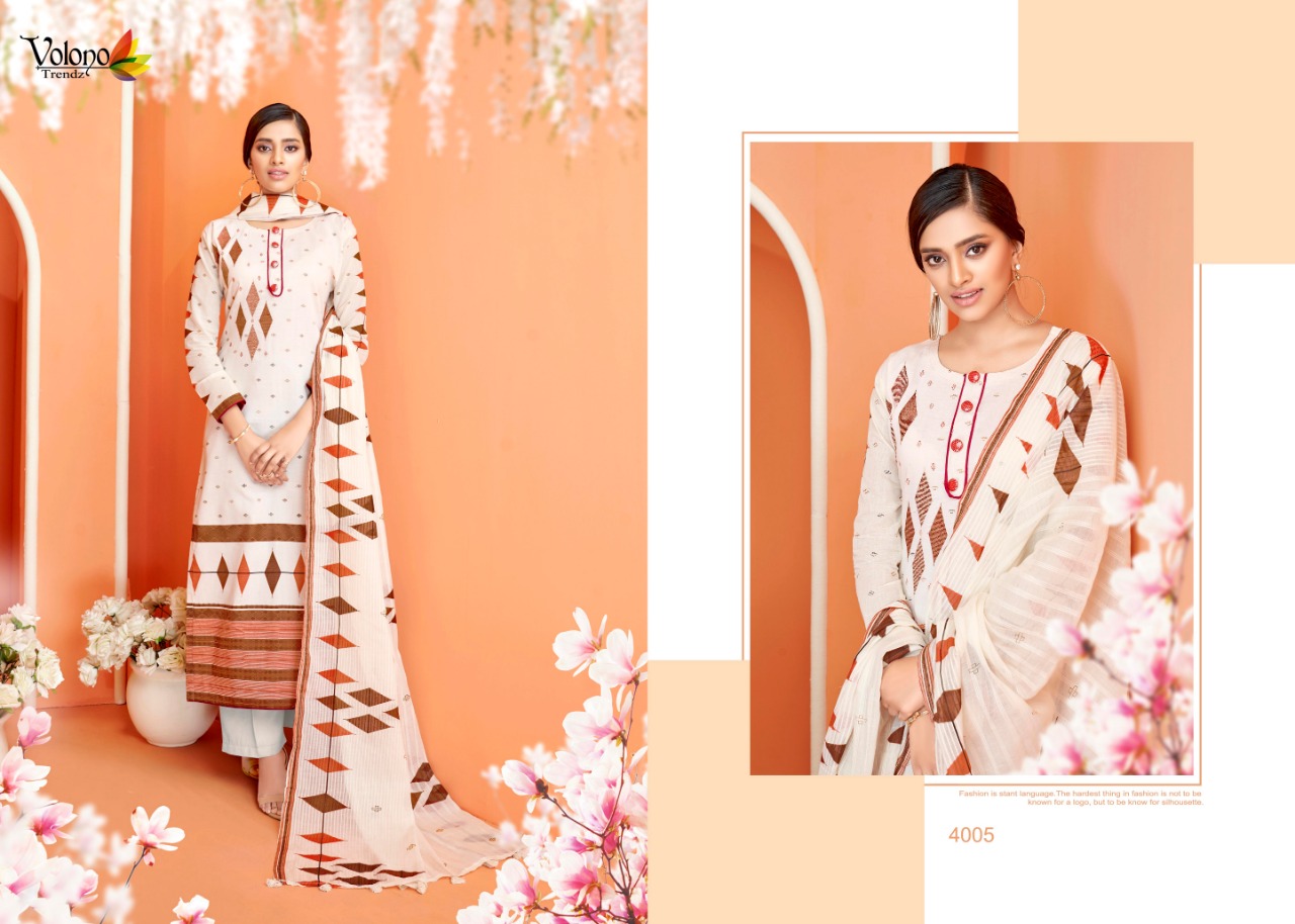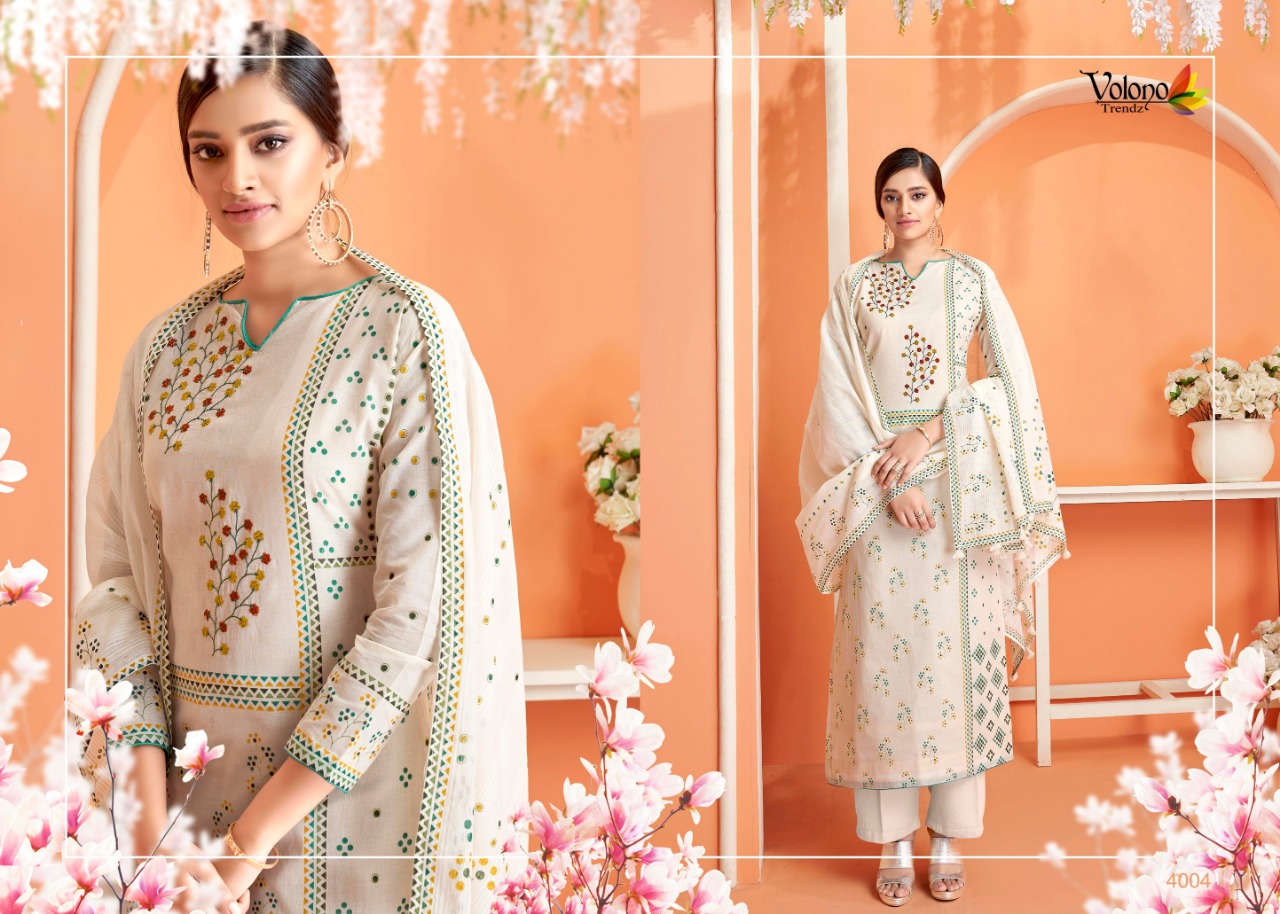 Buy Online Zara Vol 4 By Volono Trendz Cambric Cotton Embroidered Designer Suits Wholesale Supplier Gujarat 8 Pcs of Full Catalogue at Wholesale Price. Looking for Zara Vol 4 By Volono Trendz Cambric Cotton Embroidered Designer Suits Wholesale Supplier Gujarat Full Catalouge at Best Price? Buy Now Zara Vol 4 By Volono Trendz Cambric Cotton Embroidered Designer Suits Wholesale Supplier Gujarat at Wholesale Rate of Rs 5560 with Total 8 Pcs from authroized dealer and supplier of VOLONO TRENDZ Brand. Cost of Each piece is just only Rs 695 which is very low and affordable price to resale the product in your retail store ,This is Surat based Wholesale Supplier & Dealer of VOLONO TRENDZ Brand. Click on Brand name to Know more about VOLONO TRENDZ Brand's products.Call or Whatsapp on 9898838984 for booking or enquiry