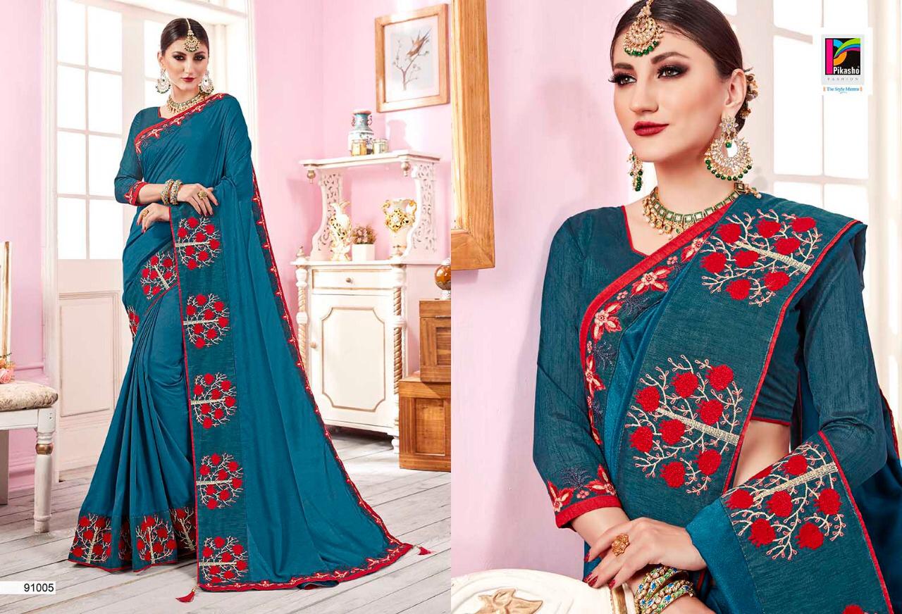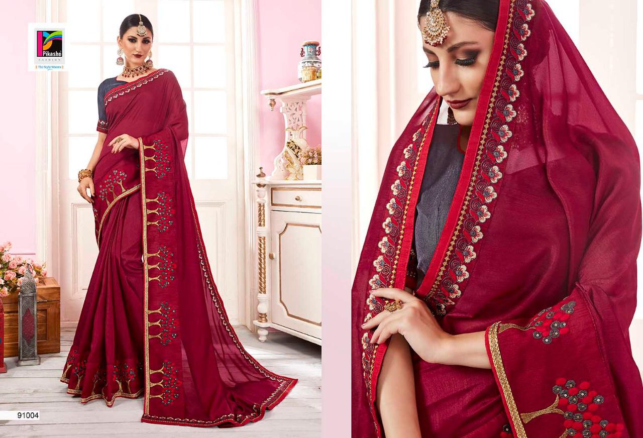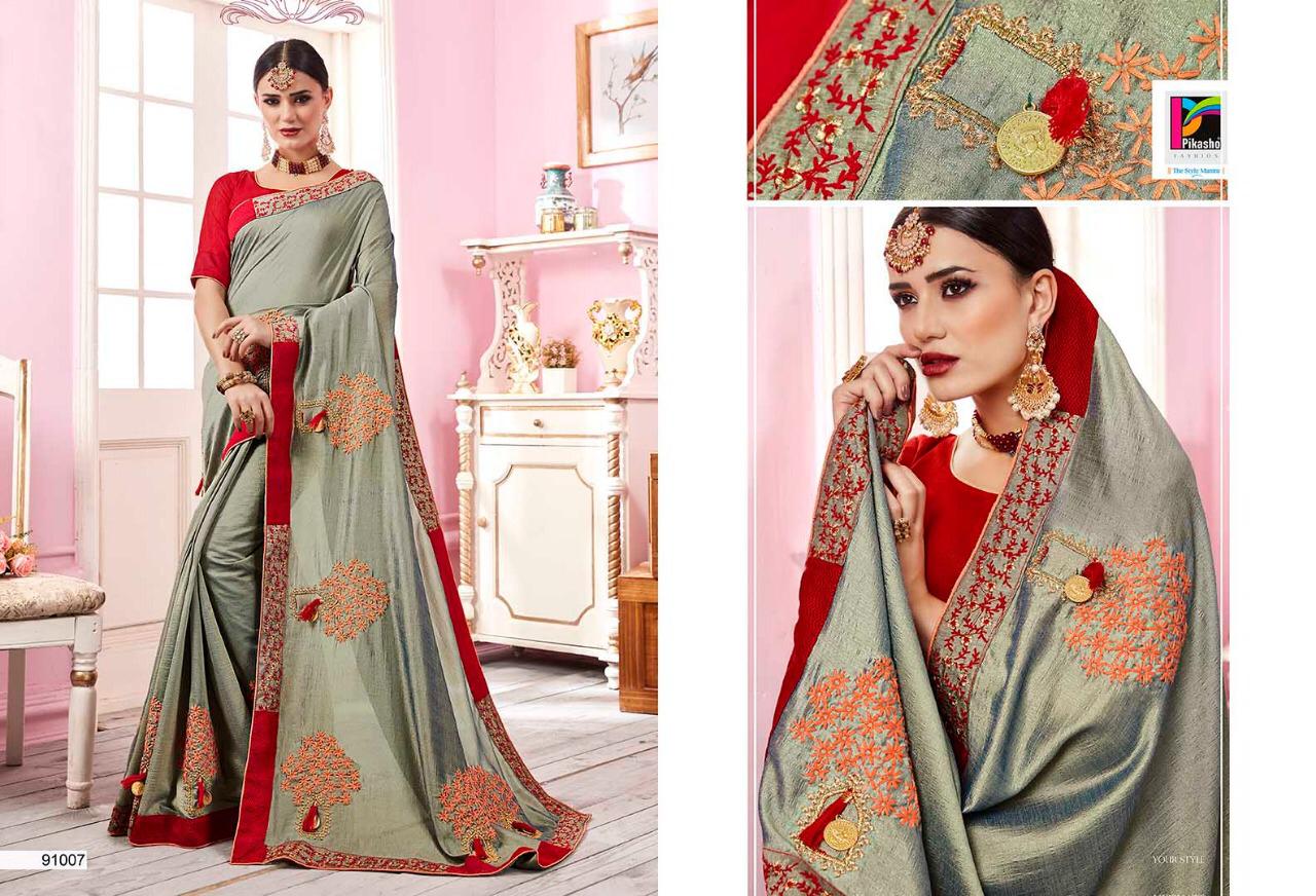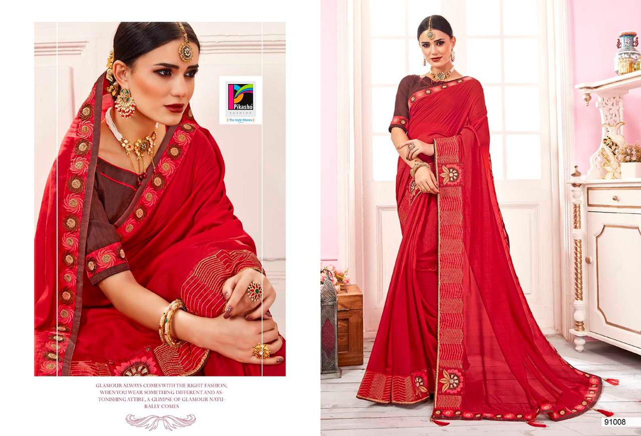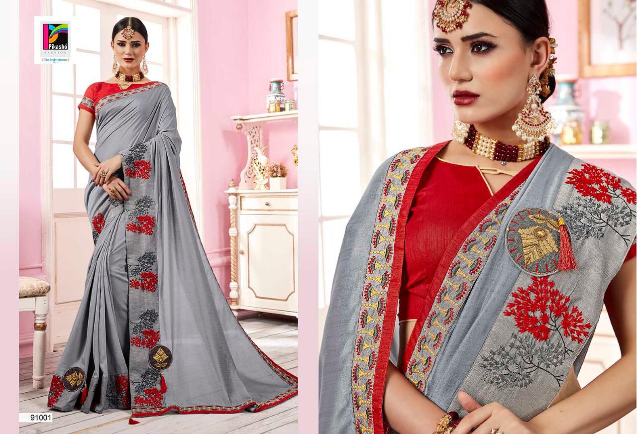 Buy Online Zareen By Pikasho 91001 Series Fancy Party Wear Saree Collection Wholesaler Surat 12 Pcs of Full Catalogue at Wholesale Price. Looking for Zareen By Pikasho 91001 Series Fancy Party Wear Saree Collection Wholesaler Surat Full Catalouge at Best Price? Buy Now Zareen By Pikasho 91001 Series Fancy Party Wear Saree Collection Wholesaler Surat at Wholesale Rate of Rs 11100 with Total 12 Pcs from authroized dealer and supplier of Pikasho Fashion Brand. Cost of Each piece is just only Rs 925 which is very low and affordable price to resale the product in your retail store ,This is Surat based Wholesale Supplier & Dealer of Pikasho Fashion Brand. Click on Brand name to Know more about Pikasho Fashion Brand's products.Call or Whatsapp on 9898838984 for booking or enquiry
