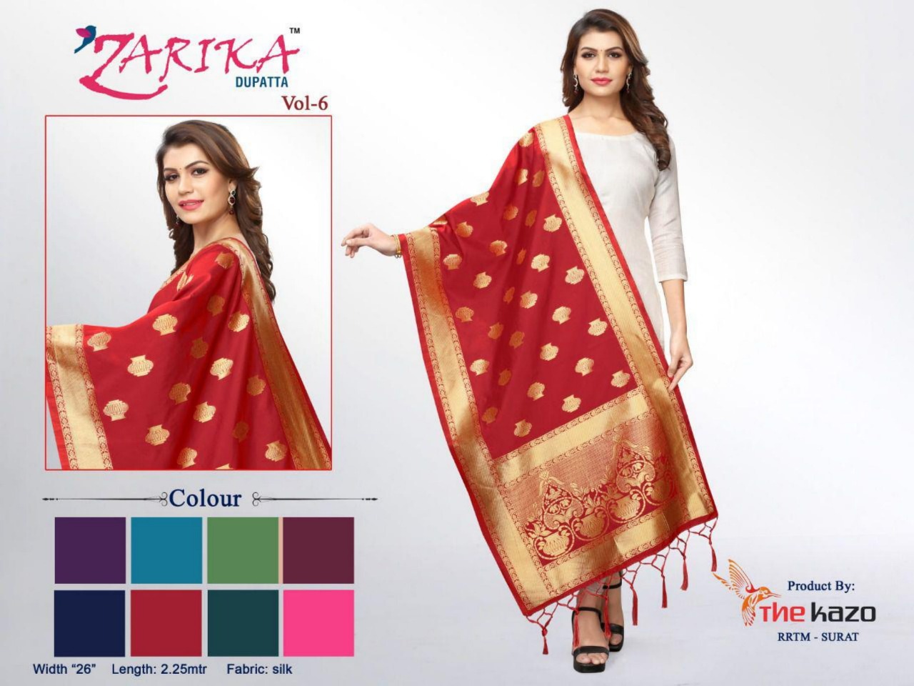 Buy Online Zarika Vol 6 By The Kazo Fancy Ethnic Wear Silk Dupatta Collection Wholesaler Surat 8 Pcs of Full Catalogue at Wholesale Price. Looking for Zarika Vol 6 By The Kazo Fancy Ethnic Wear Silk Dupatta Collection Wholesaler Surat Full Catalouge at Best Price? Buy Now Zarika Vol 6 By The Kazo Fancy Ethnic Wear Silk Dupatta Collection Wholesaler Surat at Wholesale Rate of Rs 1920 with Total 8 Pcs from authroized dealer and supplier of Brand. Cost of Each piece is just only Rs 240 which is very low and affordable price to resale the product in your retail store ,This is Surat based Wholesale Supplier & Dealer of Brand. Click on Brand name to Know more about Brand's products.Call or Whatsapp on 9898838984 for booking or enquiry