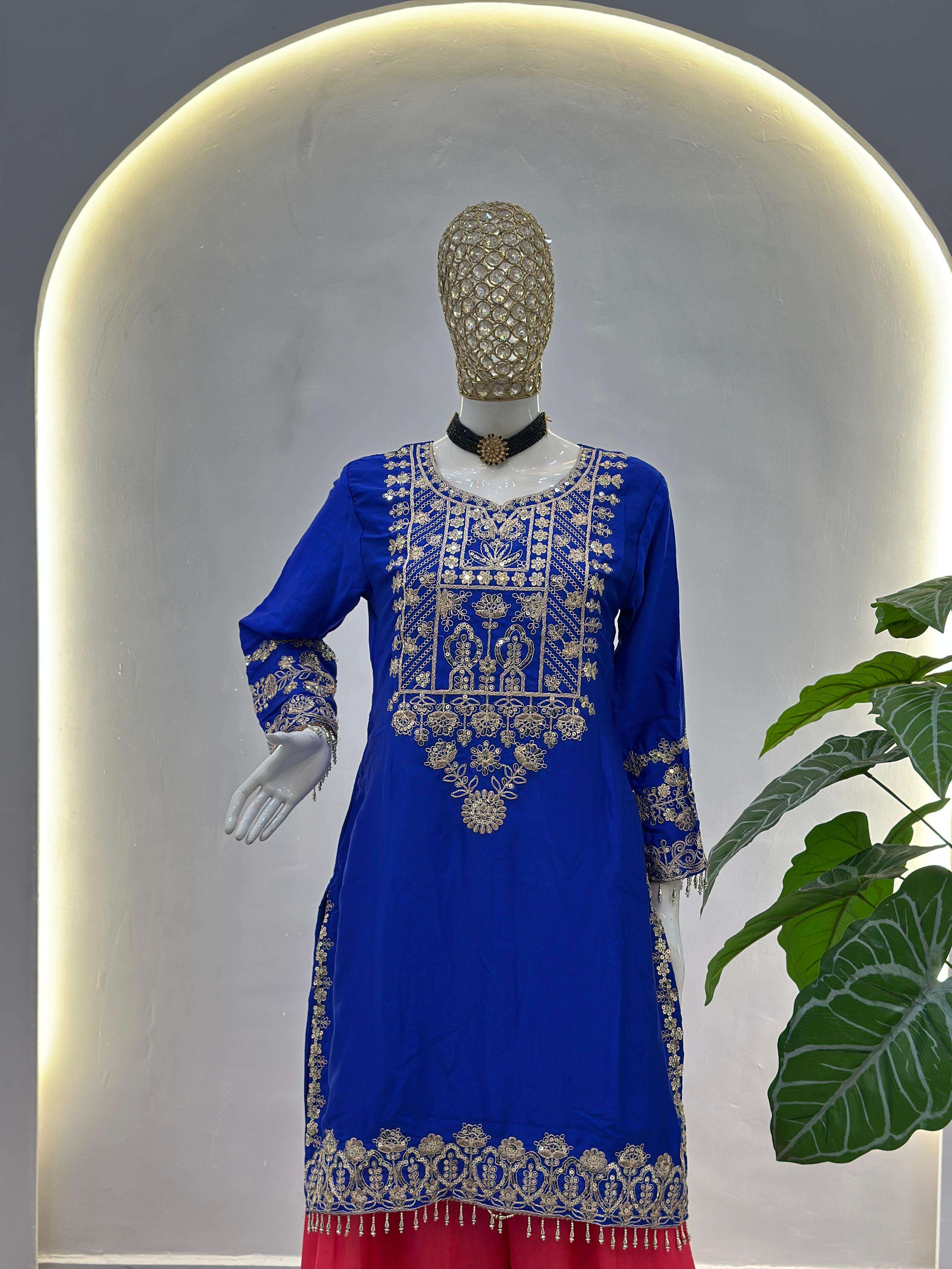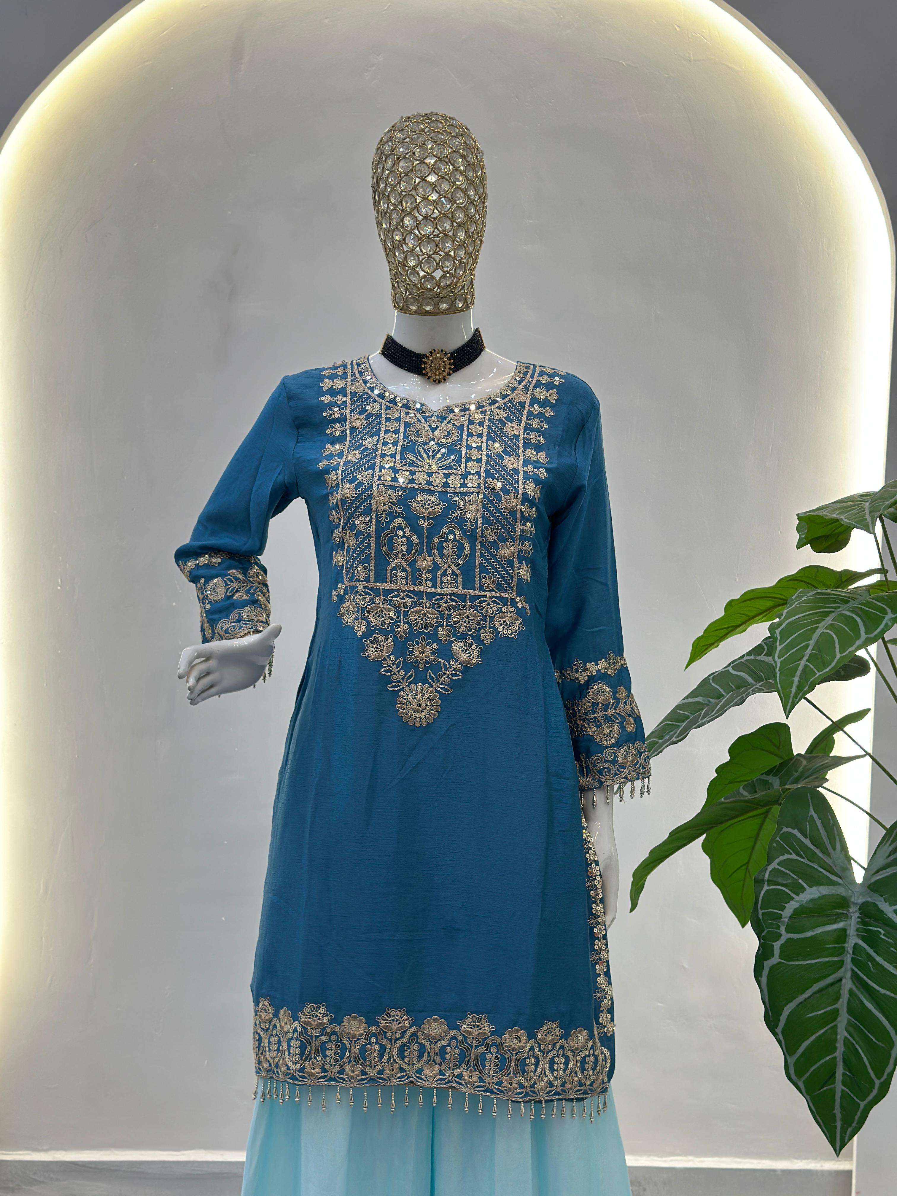 Kurti (Stitched) Kurti Fabric : Chinon Silk Kurti Innner : Crap Kurti Work : Embroidery Codding Sequence Kurti Chest Size : M(38),L(40),XL(42),2XL(44)