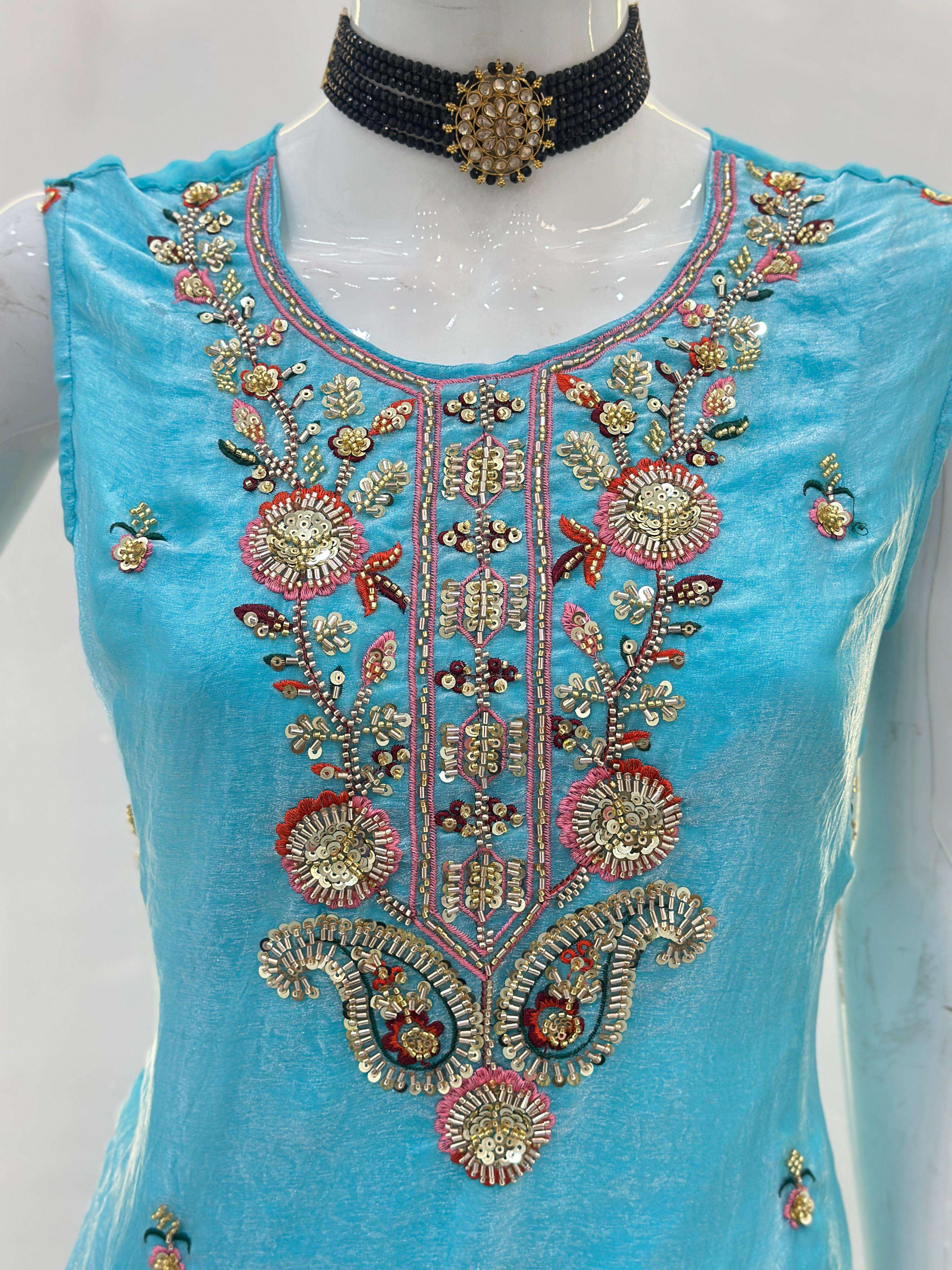 Kurti (Stitched) Kurti Fabric : Fandy Silk Kurti Innner : Crap Kurti Work : Bids Embroidery Sequence Treads Kurti Chest Size : M(38),L(40),XL(42),2XL(44) (sleeve fabric give separate)