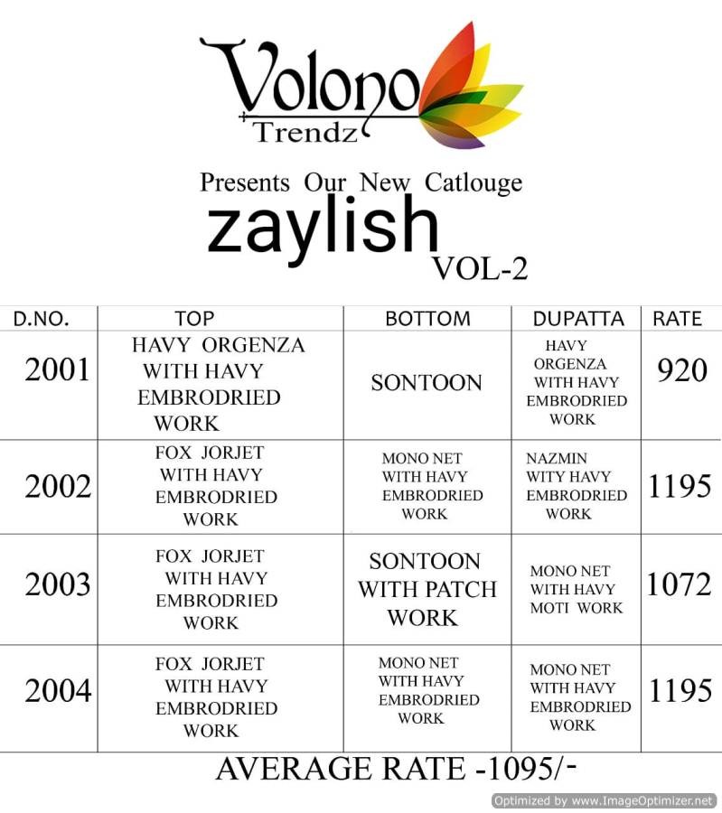 Buy Online Zaylish Vol 2 By Volono Trendz Series 2001 To 2004 Pakistani Suits Wholesale Supplier India 4 Pcs of Full Catalogue at Wholesale Price. Looking for Zaylish Vol 2 By Volono Trendz Series 2001 To 2004 Pakistani Suits Wholesale Supplier India Full Catalouge at Best Price? Buy Now Zaylish Vol 2 By Volono Trendz Series 2001 To 2004 Pakistani Suits Wholesale Supplier India at Wholesale Rate of Rs 4380 with Total 4 Pcs from authroized dealer and supplier of VOLONO TRENDZ Brand. Cost of Each piece is just only Rs 1095 which is very low and affordable price to resale the product in your retail store ,This is Surat based Wholesale Supplier & Dealer of VOLONO TRENDZ Brand. Click on Brand name to Know more about VOLONO TRENDZ Brand's products.Call or Whatsapp on 9898838984 for booking or enquiry