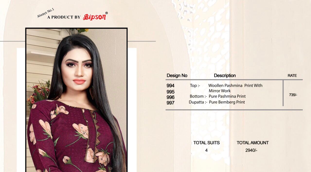 Buy Online Zeenat By Bipson Pashmina Dress Materials Wholesale Supplier Surat 4 Pcs of Full Catalogue at Wholesale Price. Looking for Zeenat By Bipson Pashmina Dress Materials Wholesale Supplier Surat Full Catalouge at Best Price? Buy Now Zeenat By Bipson Pashmina Dress Materials Wholesale Supplier Surat at Wholesale Rate of Rs 2940 with Total 4 Pcs from authroized dealer and supplier of Brand. Cost of Each piece is just only Rs 735 which is very low and affordable price to resale the product in your retail store ,This is Surat based Wholesale Supplier & Dealer of Brand. Click on Brand name to Know more about Brand's products.Call or Whatsapp on 9898838984 for booking or enquiry