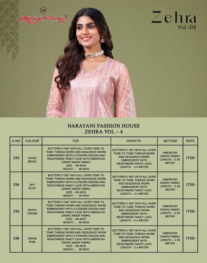 Zehra Vol 4 By Narayani Fashion Designer Work Suit Wholesaler Surat