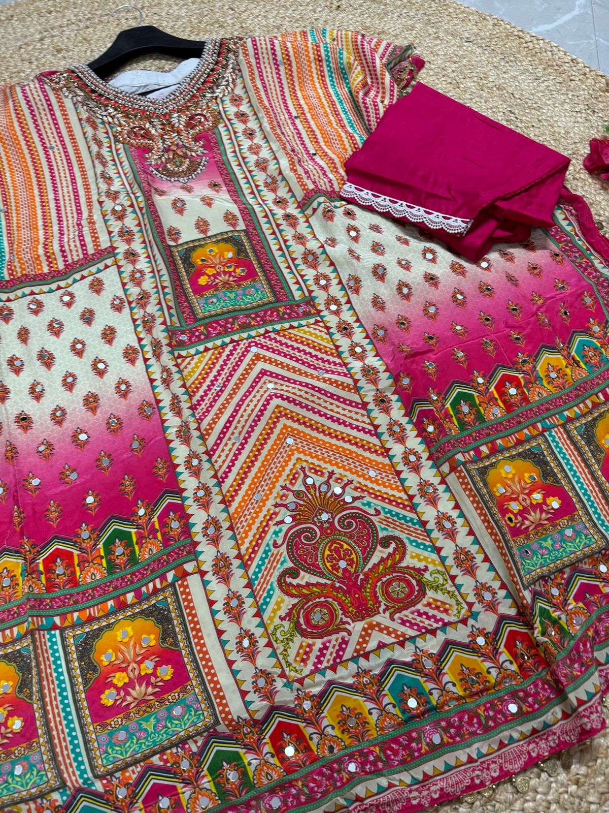Pure crepe handwork moti work stitched outfit with mirror work and coin laces and inner stitched.🥰