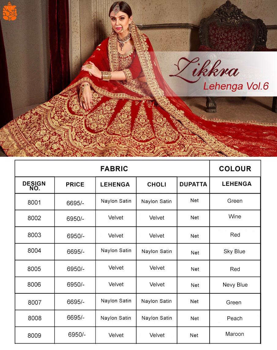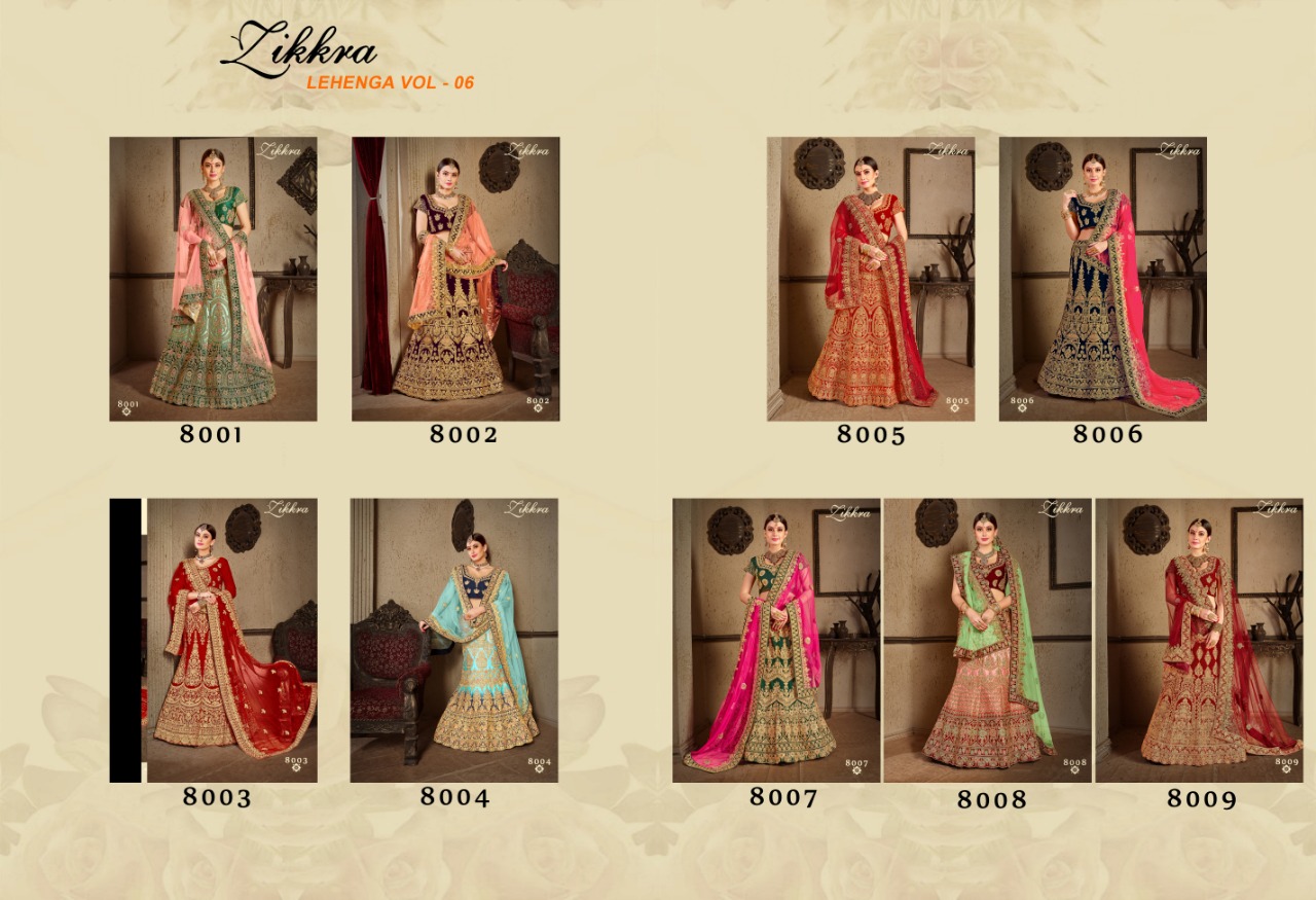 Buy Online Zikkra Lehenga Vol 06 By Zikkra 8001 Series Heavy Bridal Party Wear Lehenga Choli Catlog Wholesale Dealer And Supplier Surat 9 Pcs of Full Catalogue at Wholesale Price. Looking for Zikkra Lehenga Vol 06 By Zikkra 8001 Series Heavy Bridal Party Wear Lehenga Choli Catlog Wholesale Dealer And Supplier Surat Full Catalouge at Best Price? Buy Now Zikkra Lehenga Vol 06 By Zikkra 8001 Series Heavy Bridal Party Wear Lehenga Choli Catlog Wholesale Dealer And Supplier Surat at Wholesale Rate of Rs 61533 with Total 9 Pcs from authroized dealer and supplier of ZIKKRA Brand. Cost of Each piece is just only Rs 6837 which is very low and affordable price to resale the product in your retail store ,This is Surat based Wholesale Supplier & Dealer of ZIKKRA Brand. Click on Brand name to Know more about ZIKKRA Brand's products.Call or Whatsapp on 9898838984 for booking or enquiry