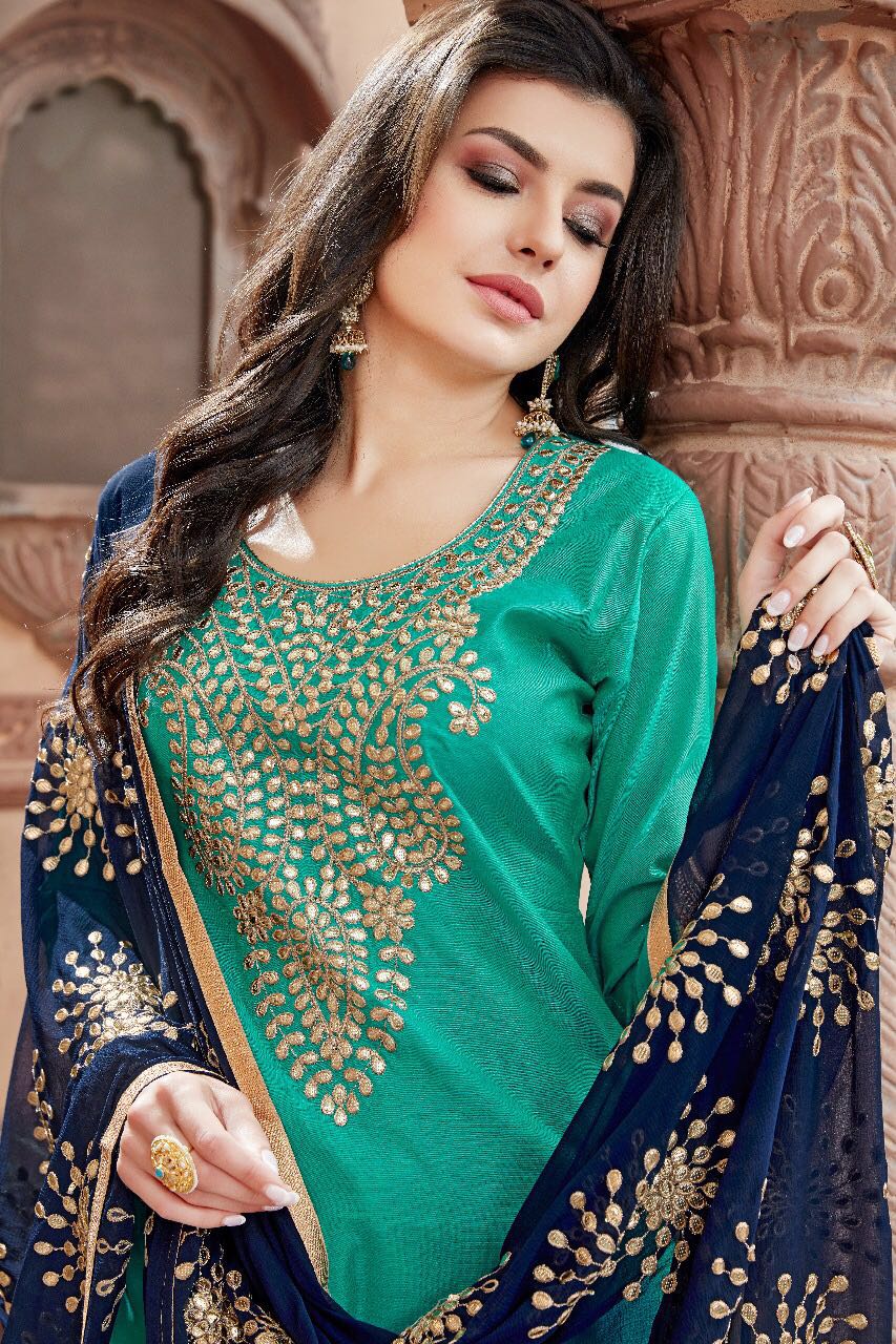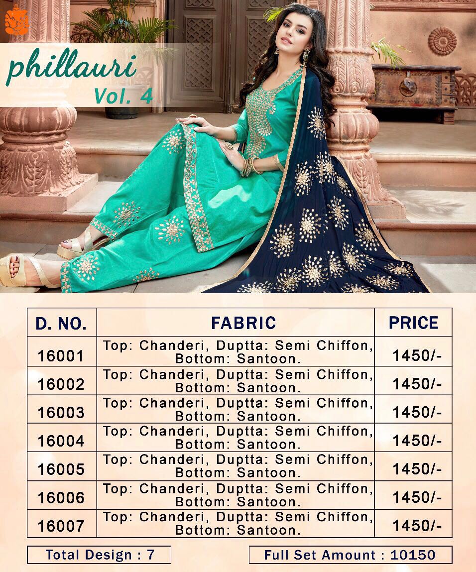 We are presenting Phillauri Vol - 4 after the Great Success of Phillauri Vol-3. New stylish Gota Patti Patterns Salwar Suit with *Contrast Dupatta Concept and Gota patti work on bottom. Catalog------Phillauri Vol - 4 Fabrics----- Top - Chanderi Bottom - Santoon Dupatta - Semi-Chiffon Rate--1450/- + 5% GST Extra TypeÂ?-Unstitch Top and Bottom with Gotta Patti Work Set to set . GST 5 Percent Extra. |