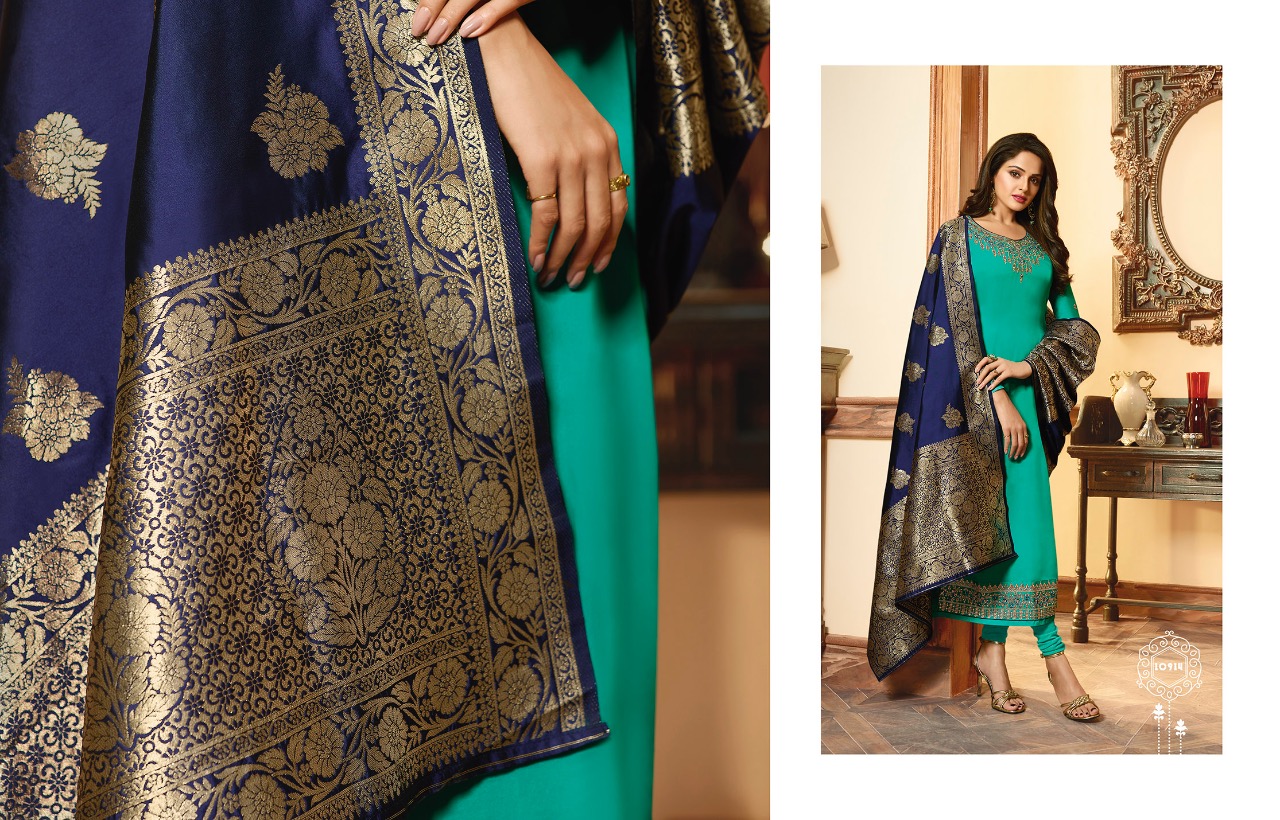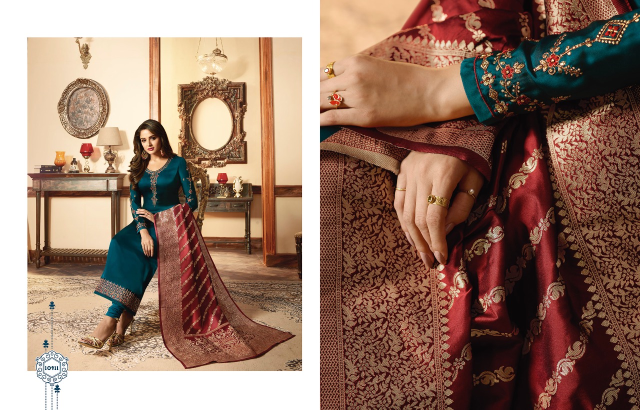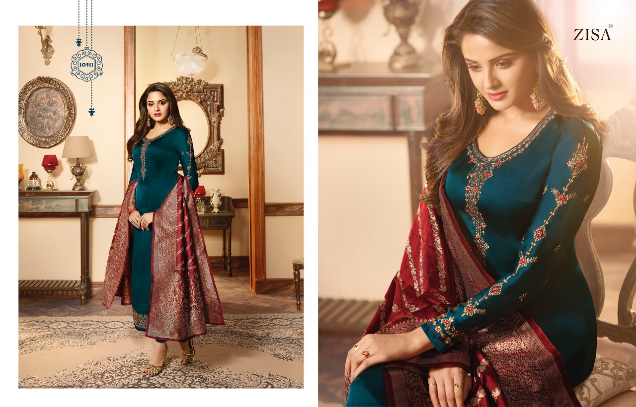 Zisa banrasi 5 Top-satin jorgget with work Duppta-banarsi jacquard Bottom inner-dull santoon Average price-1170 GST 5 Percent Extra |