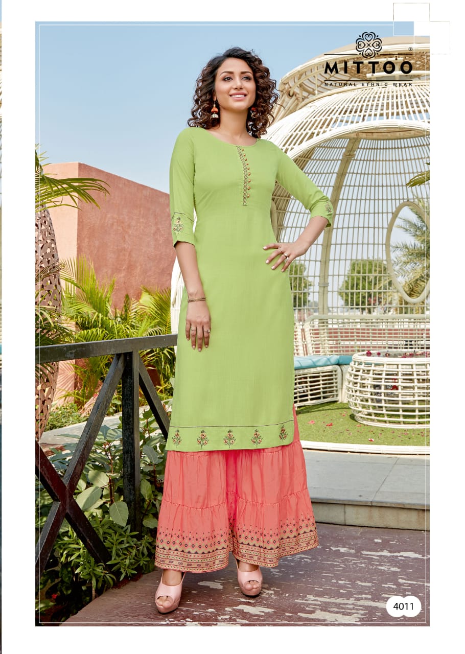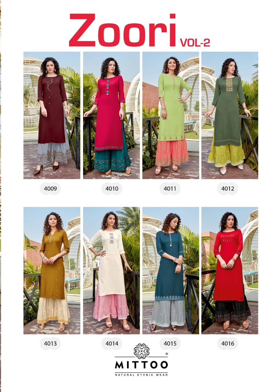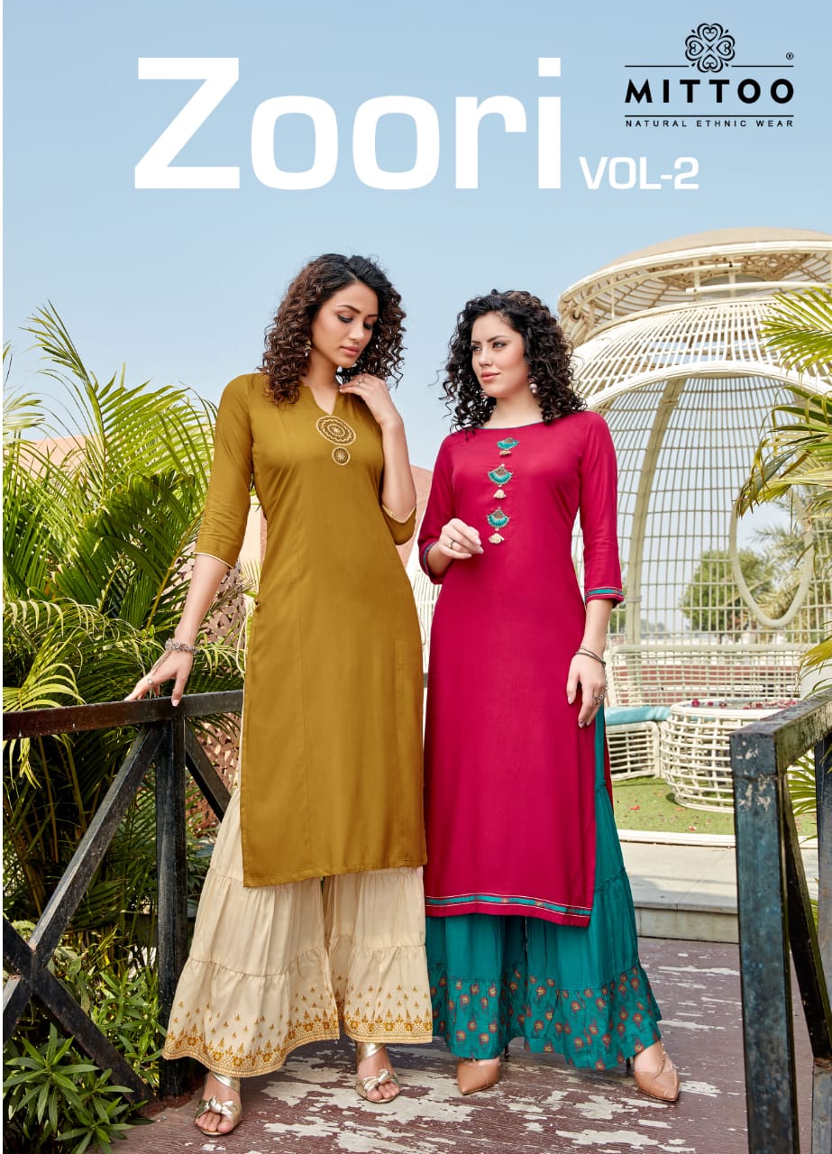 Buy Online Zoori 2 By Mittoo Kurti With Sharara Wholesale Supplier Gujarat 8 Pcs of Full Catalogue at Wholesale Price. Looking for Zoori 2 By Mittoo Kurti With Sharara Wholesale Supplier Gujarat Full Catalouge at Best Price? Buy Now Zoori 2 By Mittoo Kurti With Sharara Wholesale Supplier Gujarat at Wholesale Rate of Rs 6560 with Total 8 Pcs from authroized dealer and supplier of MITTOO Brand. Cost of Each piece is just only Rs 820 which is very low and affordable price to resale the product in your retail store ,This is Surat based Wholesale Supplier & Dealer of MITTOO Brand. Click on Brand name to Know more about MITTOO Brand's products.Call or Whatsapp on 9898838984 for booking or enquiry