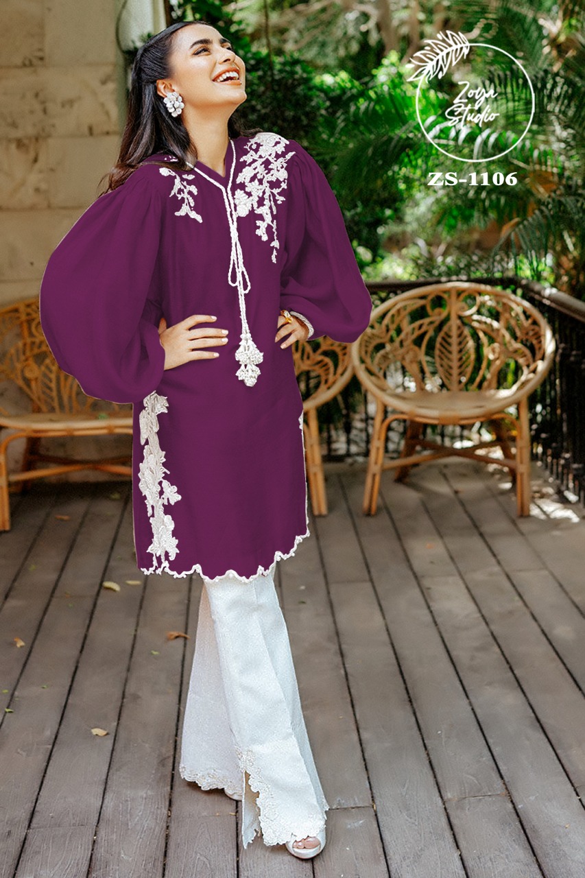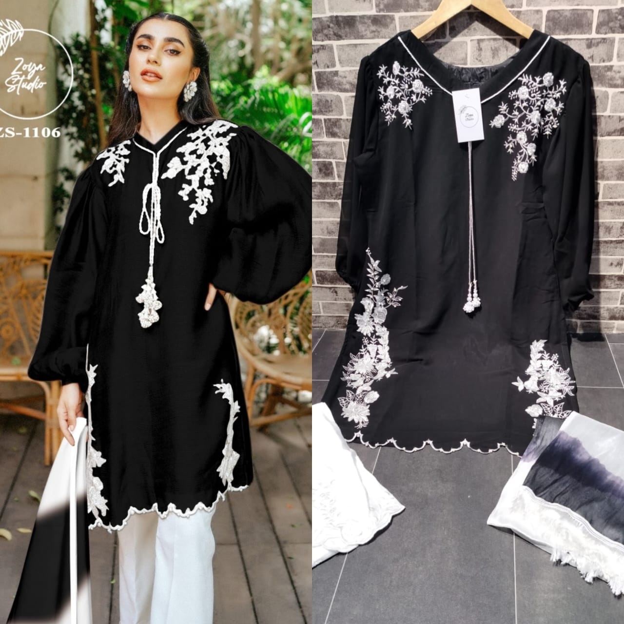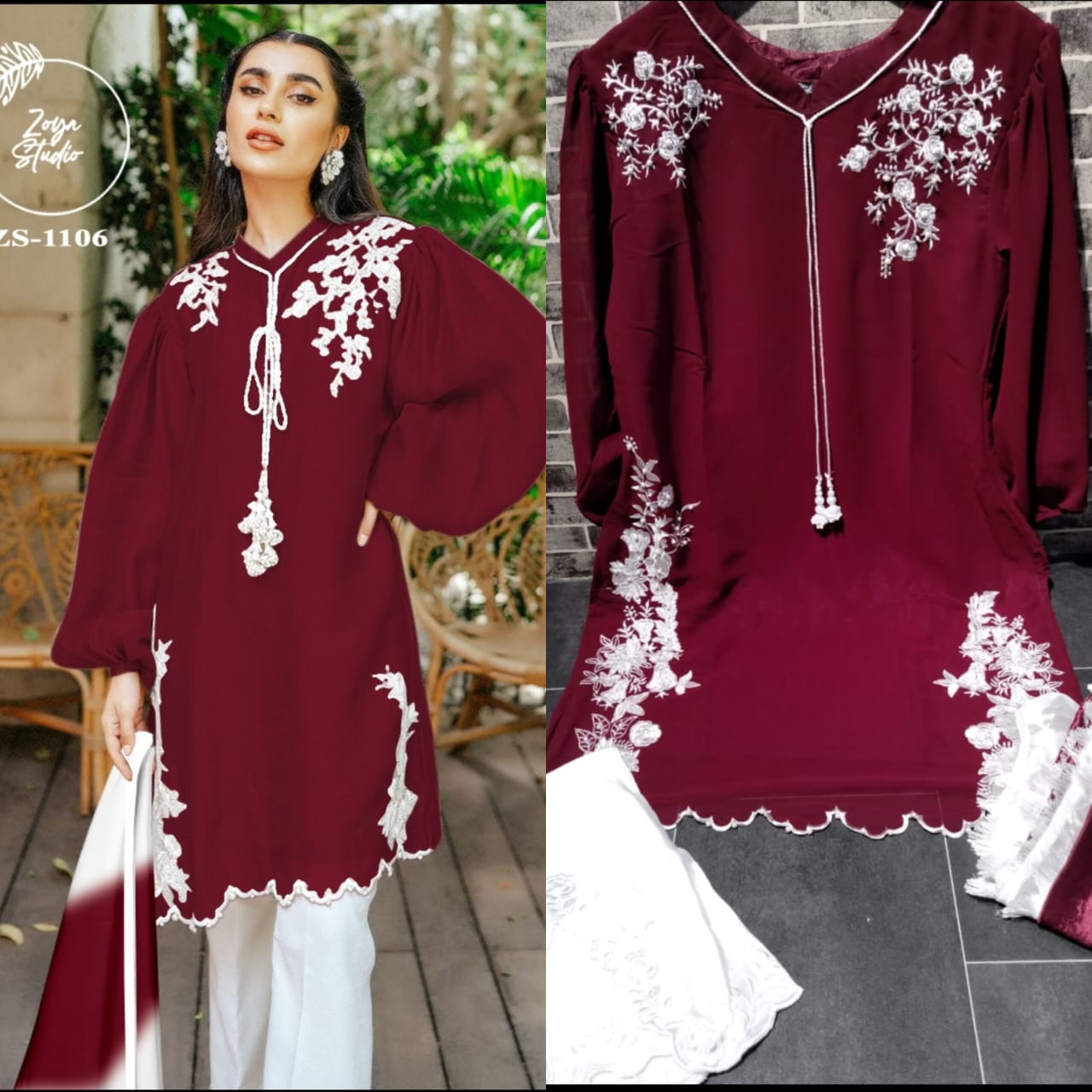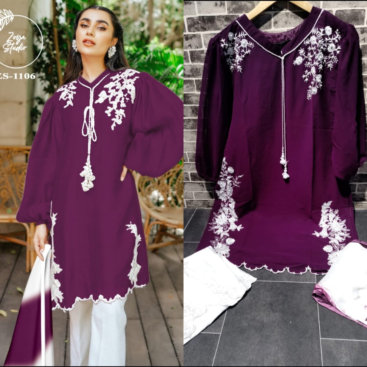 *New Colour Added* *? _Zoya Studio Present_?* *?Ready to wear collection?* ?We are Introducing our *LUXURY PRET FORMAL WEAR COLLECTION* To Make You look Unique and Classy.. ? *With Supirier Quality* ????? by *_#Zoya Studio_* *(#ZS-1106)* ?????? ? *Description* ? ??????? *#zoyastudio Presents kurta with embroidery detailing on the neckline and hem, enhanced with a handcrafted pearl tassel, and statement exaggerated sleeves. It has been paired with rawsilk boot-cut pants with scalloped embroidery detailing* ? *Details*? ??????? ? *Top*:- *Pure Georgette Fabric* ? *Bottom* :- *100% Jaam Cotton Fabrics* ? *Inner*- *Santoon* ? *Dupatta*- *Chinon Shaded Dupatta With Two Side Lace* ? *3 Colours* 1) *Black* 2) *Purple* 3) *Maroon* ? *Size Chart*? ? *Top xl size chest* (42) ? *Bottom xl size* (38) *Full set available* *Price:- 1350?/-* GST extra Set to set ???Colour may slightly vary due to light effect??? ? *Book Fast Limited Stock* ? |