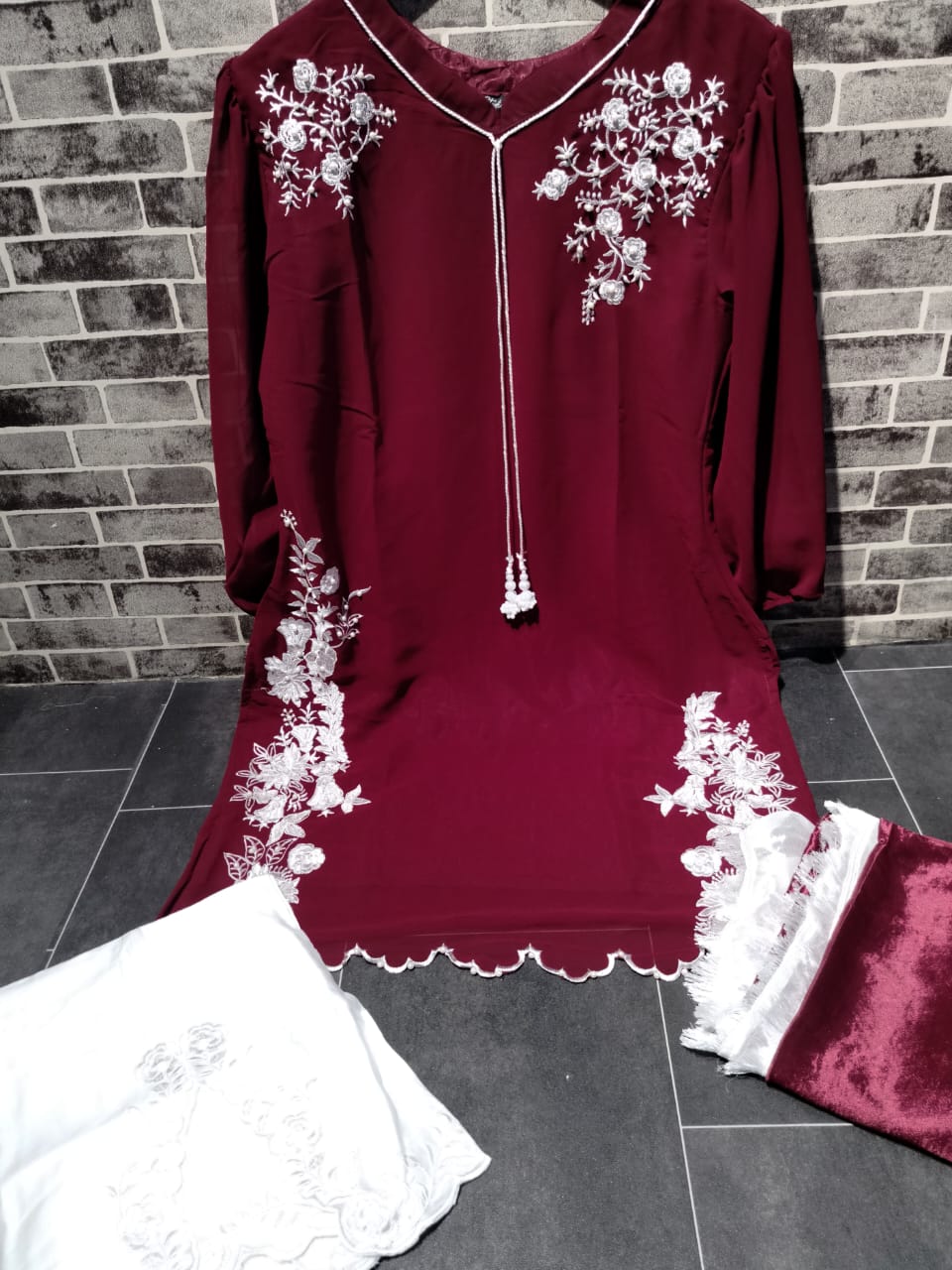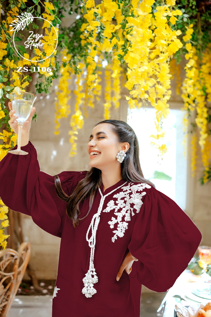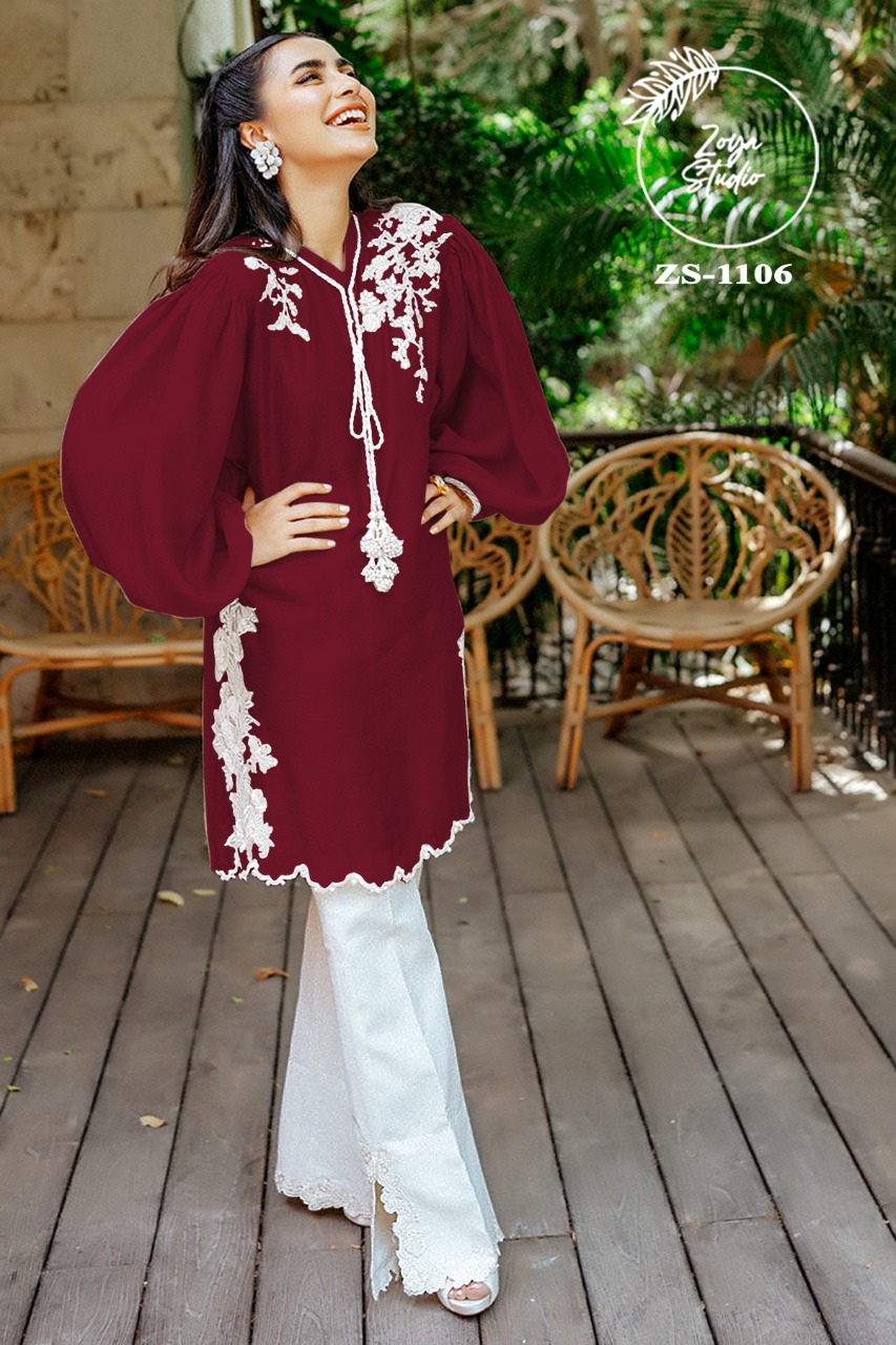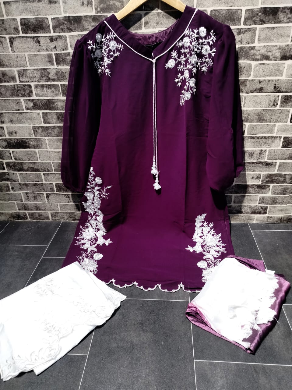 *New Colour Added* *? _Zoya Studio Present_?* *?Ready to wear collection?* ?We are Introducing our *LUXURY PRET FORMAL WEAR COLLECTION* To Make You look Unique and Classy.. ? *With Supirier Quality* ????? by *_#Zoya Studio_* *(#ZS-1106)* ?????? ? *Description* ? ??????? *#zoyastudio Presents kurta with embroidery detailing on the neckline and hem, enhanced with a handcrafted pearl tassel, and statement exaggerated sleeves. It has been paired with rawsilk boot-cut pants with scalloped embroidery detailing* ? *Details*? ??????? ? *Top*:- *Pure Georgette Fabric* ? *Bottom* :- *100% Jaam Cotton Fabrics* ? *Inner*- *Santoon* ? *Dupatta*- *Chinon Shaded Dupatta With Two Side Lace* ? *3 Colours* 1) *Black* 2) *Purple* 3) *Maroon* ? *Size Chart*? ? *Top xl size chest* (42) ? *Bottom xl size* (38) *Full set available* *Price:- 1350?/-* GST extra Set to set ???Colour may slightly vary due to light effect??? ? *Book Fast Limited Stock* ? |