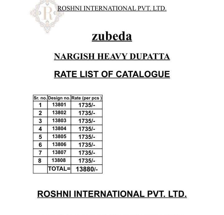 Buy Online Zubeda Nargis Heavy Dupatta 13801 Series Party Wear Suit 8 Pcs of Full Catalogue at Wholesale Price. Looking for Zubeda Nargis Heavy Dupatta 13801 Series Party Wear Suit Full Catalouge at Best Price? Buy Now Zubeda Nargis Heavy Dupatta 13801 Series Party Wear Suit at Wholesale Rate of Rs 13880 with Total 8 Pcs from authroized dealer and supplier of ZUBEDA Brand. Cost of Each piece is just only Rs 1735 which is very low and affordable price to resale the product in your retail store ,This is Surat based Wholesale Supplier & Dealer of ZUBEDA Brand. Click on Brand name to Know more about ZUBEDA Brand's products.Call or Whatsapp on 9898838984 for booking or enquiry