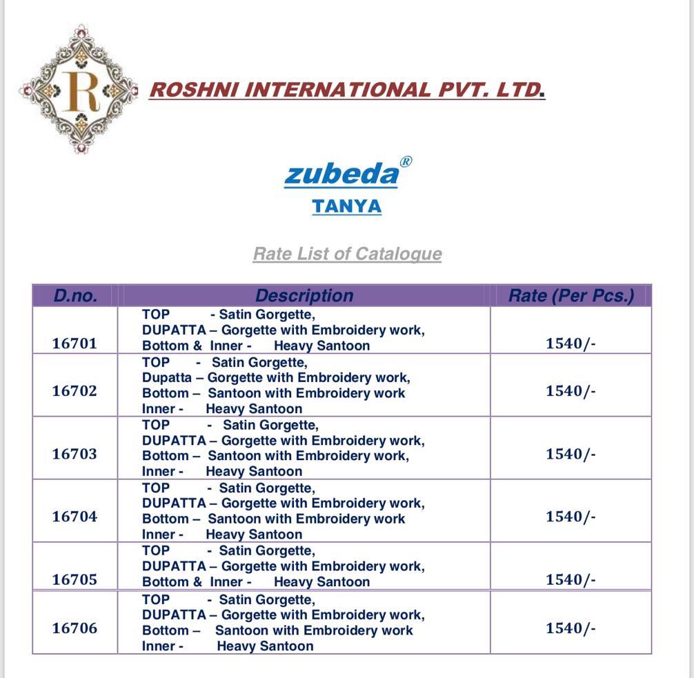 Buy Online Zubeda Tanya Series 16701 To 16706 Georgette Embroidered Designer Party Wear Suits Wholesale Supplier Gujarat 6 Pcs of Full Catalogue at Wholesale Price. Looking for Zubeda Tanya Series 16701 To 16706 Georgette Embroidered Designer Party Wear Suits Wholesale Supplier Gujarat Full Catalouge at Best Price? Buy Now Zubeda Tanya Series 16701 To 16706 Georgette Embroidered Designer Party Wear Suits Wholesale Supplier Gujarat at Wholesale Rate of Rs 9240 with Total 6 Pcs from authroized dealer and supplier of ZUBEDA Brand. Cost of Each piece is just only Rs 1540 which is very low and affordable price to resale the product in your retail store ,This is Surat based Wholesale Supplier & Dealer of ZUBEDA Brand. Click on Brand name to Know more about ZUBEDA Brand's products.Call or Whatsapp on 9898838984 for booking or enquiry