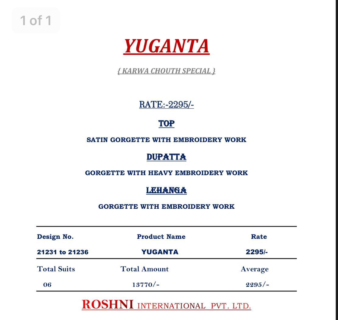 Buy Online Zubeda Yuganta Series 21231 Designer Party Wear Suits Wholesale Supplier Gujarat 6 Pcs of Full Catalogue at Wholesale Price. Looking for Zubeda Yuganta Series 21231 Designer Party Wear Suits Wholesale Supplier Gujarat Full Catalouge at Best Price? Buy Now Zubeda Yuganta Series 21231 Designer Party Wear Suits Wholesale Supplier Gujarat at Wholesale Rate of Rs 13770 with Total 6 Pcs from authroized dealer and supplier of ZUBEDA Brand. Cost of Each piece is just only Rs 2295 which is very low and affordable price to resale the product in your retail store ,This is Surat based Wholesale Supplier & Dealer of ZUBEDA Brand. Click on Brand name to Know more about ZUBEDA Brand's products.Call or Whatsapp on 9898838984 for booking or enquiry