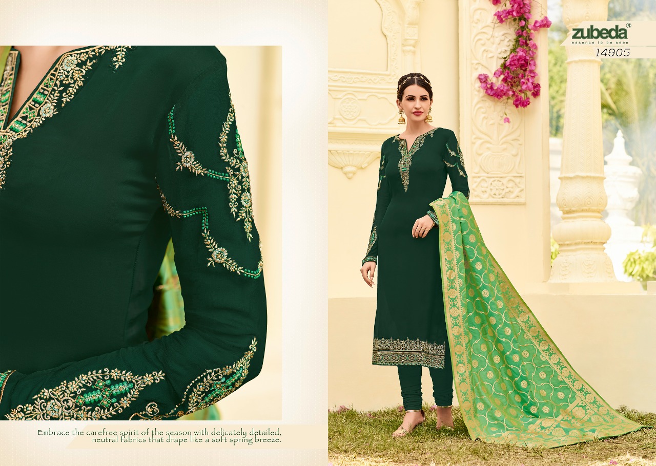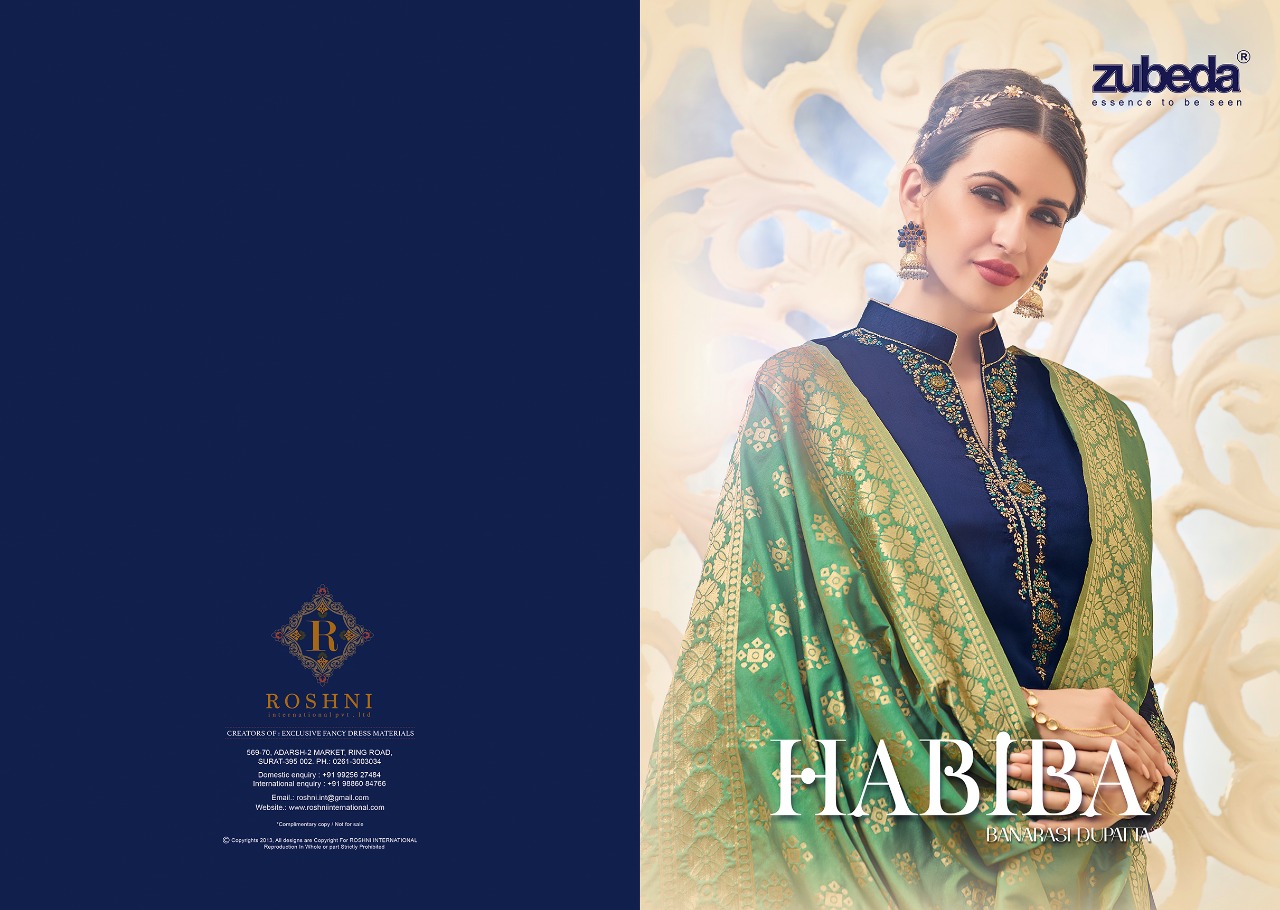 Buy Online Zuebda Habiba Banarasi Duptta Series 14901 To 14905 Designer Suits Wholesale Supplier And Dealer Surat 5 Pcs of Full Catalogue at Wholesale Price. Looking for Zuebda Habiba Banarasi Duptta Series 14901 To 14905 Designer Suits Wholesale Supplier And Dealer Surat Full Catalouge at Best Price? Buy Now Zuebda Habiba Banarasi Duptta Series 14901 To 14905 Designer Suits Wholesale Supplier And Dealer Surat at Wholesale Rate of Rs 6975 with Total 5 Pcs from authroized dealer and supplier of ZUBEDA Brand. Cost of Each piece is just only Rs 1395 which is very low and affordable price to resale the product in your retail store ,This is Surat based Wholesale Supplier & Dealer of ZUBEDA Brand. Click on Brand name to Know more about ZUBEDA Brand's products.Call or Whatsapp on 9898838984 for booking or enquiry