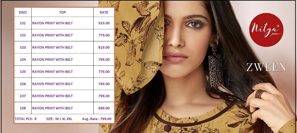 Buy Online Zween By Lt Nitya Reyon Tunic Style Kurtis With Belt Series 101 To 108 Wholesale Dealer And Supplier Surat. 8 Pcs of Full Catalogue at Wholesale Price. Looking for Zween By Lt Nitya Reyon Tunic Style Kurtis With Belt Series 101 To 108 Wholesale Dealer And Supplier Surat. Full Catalouge at Best Price? Buy Now Zween By Lt Nitya Reyon Tunic Style Kurtis With Belt Series 101 To 108 Wholesale Dealer And Supplier Surat. at Wholesale Rate of Rs 6392 with Total 8 Pcs from authroized dealer and supplier of LT FABRICS Brand. Cost of Each piece is just only Rs 799 which is very low and affordable price to resale the product in your retail store ,This is Surat based Wholesale Supplier & Dealer of LT FABRICS Brand. Click on Brand name to Know more about LT FABRICS Brand's products.Call or Whatsapp on 9898838984 for booking or enquiry