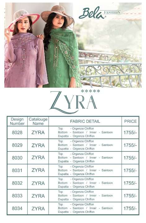 Buy Online Zyra by Bela organza chiffon suit collection manufacturer surat 7 Pcs of Full Catalogue at Wholesale Price. Looking for Zyra by Bela organza chiffon suit collection manufacturer surat Full Catalouge at Best Price? Buy Now Zyra by Bela organza chiffon suit collection manufacturer surat at Wholesale Rate of Rs 12285 with Total 7 Pcs from authroized dealer and supplier of BELA Brand. Cost of Each piece is just only Rs 1755 which is very low and affordable price to resale the product in your retail store ,This is Surat based Wholesale Supplier & Dealer of BELA Brand. Click on Brand name to Know more about BELA Brand's products.Call or Whatsapp on 9898838984 for booking or enquiry
